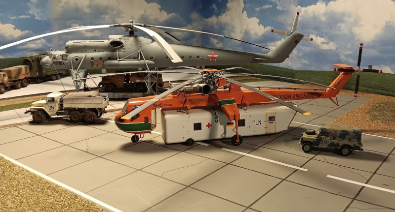 Mein Modell soll die Maschine in den 1980er Jahren zeigen, als sie in Afghanistan im Dienste der UN stand. Der Größenvergleich mit der Mi-10 zeigt deren Größe.