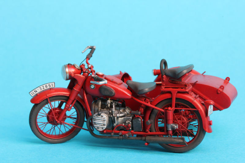 Es stand von vornherein fest, ein ziviles Mopped darstellten zu wollen, hierbei käme Unischwarz als erste Wahl in Frage, allerdings sind hierbei die Zierstreifen bei der Darstellung unabdingbar, die Beiwagen-Vorgabe erweiterte die Möglichkeit. Die R 71 war seinerzeit, 1938 für schlappe 1.595 Reichsmark zu haben, damals etwa Jahres-Nettoeinkommen eines Angestellten, womit sich die Auswahl der Käufer auf Behörden und Armee einschränkte.
