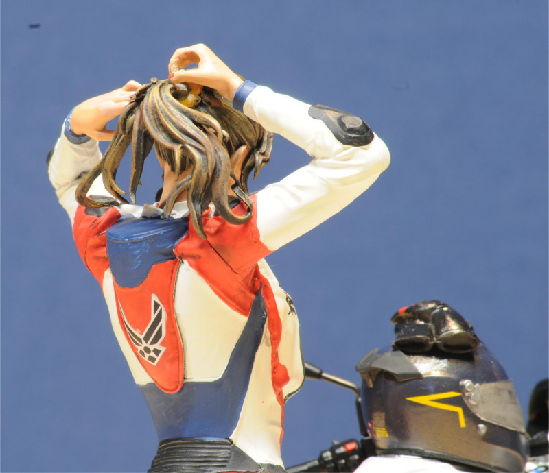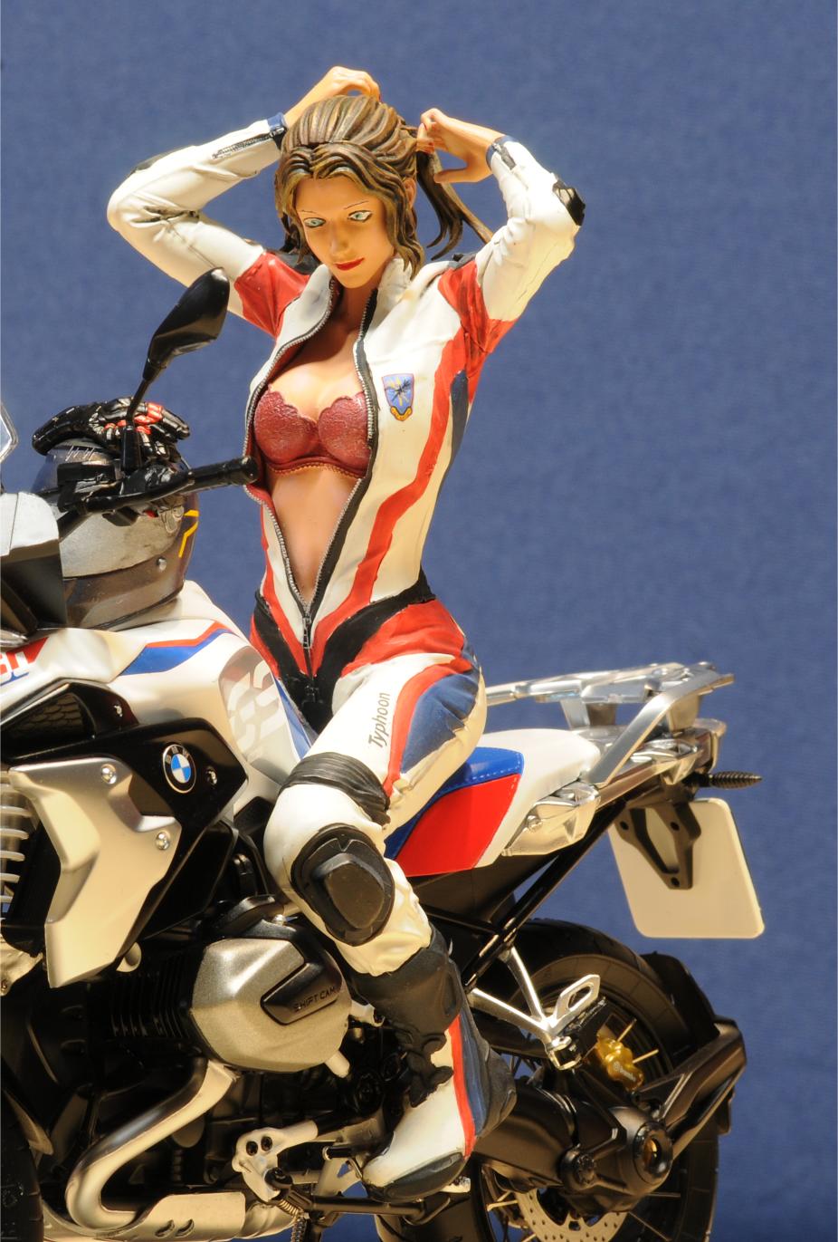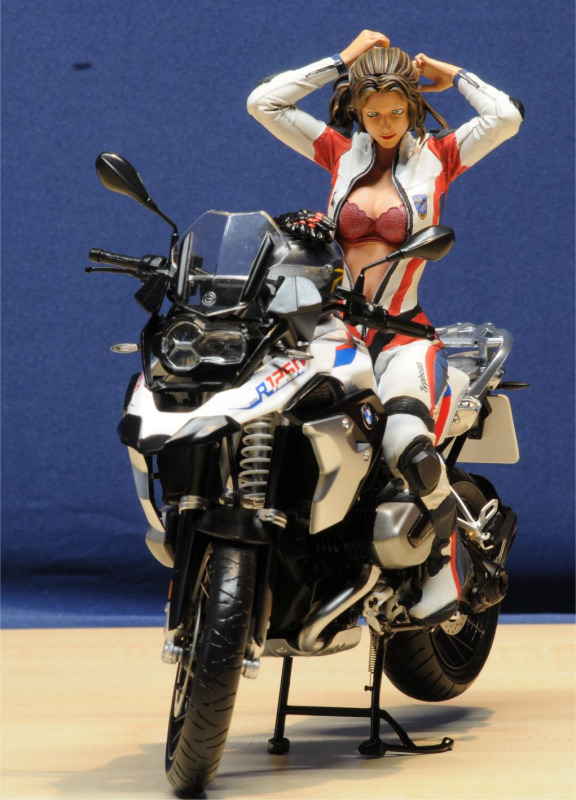 Die Figur ist hochdetailliert. Zu kleben ist sie ausschließlich mit Sekundenkleber, nur wenig Spachtelarbeiten sind notwendig. Die Dame richtet sich gerade die Haare, um den Helm aufzusetzen. Es muss heiß sein, sie hat den Lederkombi bis weit unter den Bauchnabel geöffnet und nur Dessous darunter… Der Figuren-Designer hat sehr gute Darstellungen der Faltengebung des Lederkombis gemacht. Wichtige Details wie Sturzpads an den exponierten Gelenken, Wirbelsäule und Schultern sind vorhanden. Knieschleifer sind an beiden Knien richtig positioniert. Sogar ein sehr sauberer Reißverschluss für die Einteiler-Kombi ist da. Die Stiefel verdienen den Namen auch. Auch hier sind sogar Schleifpads an den vorderen Außenkanten richtig positioniert. Etwas erotisch wird es mit dem BH der Dame - auch er ist hoch detailiert. Die Farbwahl ist jedem selbst überlassen. Aber selbst kleinste Details wie Spitzenverzierungen sind erkennbar. Hoffentlich wird bei der sorgfältigen Farbgestaltung dieses Bauabschnitts nicht die Lebensgefährtin eifersüchtig…