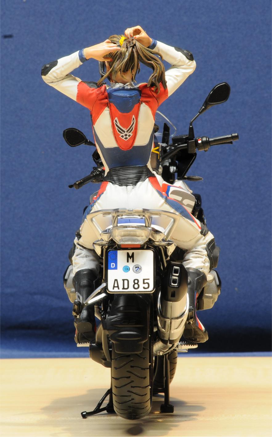 Zum Original? Da kann ich leider aus eigener Anschauung nur sagen, dass es viel zu wenig Motorradfahrerinnen gibt. Auch die gewählte Farbvariante ist rein meiner Fantasie entsprungen, wie auch die Aufschriften und Patches auf dem Motorradkombi.