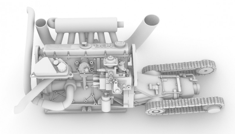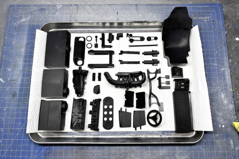 Zunächst entstand ein Prototyp mit geschlossener Karosserie, um die Form zu testen. Anschließend folgte das komplett ausgearbeitete Funktionsmodell, das ich – wie immer – vom Reißbrett weg in CAD konstruiert und anschließend im 3D-Druck gefertigt habe. Alle Teile wurden präzise montiert und in zahlreichen Arbeitsstunden zur finalen Version zusammengesetzt. Der Diesel und einige seiner Teile sowie Teile vom Fahrgestell