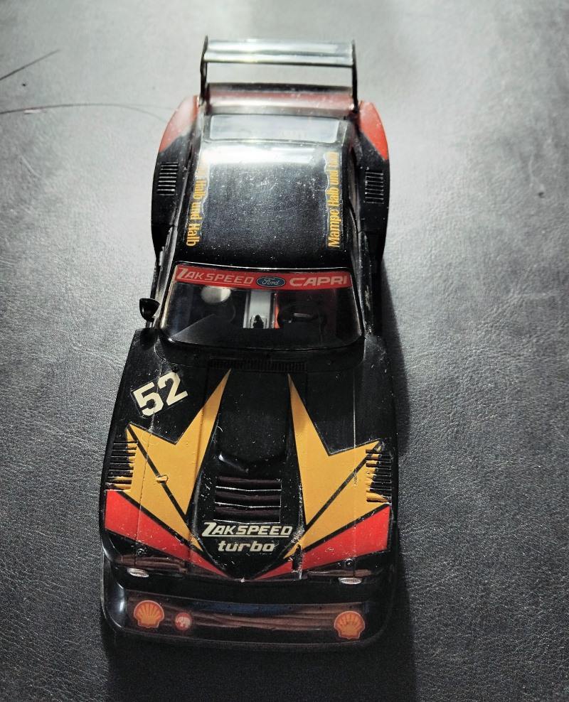 Hier möchte ich meinen vor 44 Jahren gebauten Ford Capri Zakspeed vorstellen. Zakspeed war damals ein deutscher Rennstall. Gebaut OOB, lackiert mit der Spraydose aus dem Baumarkt (schwarz glänzend), den Rest mit dem Pinsel und Humbrol-Farben. Die Passform war gut, genauso die Decals. Ein "Weekend Bausatz", dessen Bau wie immer Spaß gemacht hat.