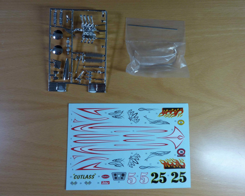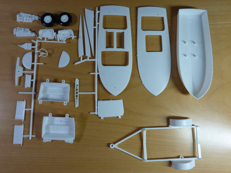Der Bausatz des Bootes ist schlicht (Formen aus 1960!) gehalten, es ist jedoch ein schöner Motor mit drei Vergasern und hochgezogenen Auspuffrohren zu bauen. Dazu kommen Zündkabel und etwas Verdrahtung. Die Lackierung erfolgte mit Tamiya-Sprühfarbe.