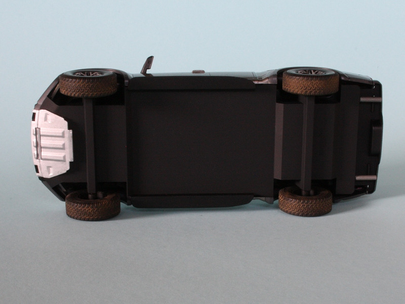 Nach der Lackierung der Innenraumwanne in Revell 302 folgte eine Detailbemalung. Die orangen Decals für die Sitzflanken wurden nicht verwendet, hier kam Humbrol RAL 2000 zum Einsatz. Später wurden die Sitze noch mit mattem Klarlack bemalt. Auch das Armaturenbrett erhielt eine Detailbemalung mit den Farbtönen Revell 43 und Humbrol 27002. Die mit angegossene Ladefläche wurde wieder mit abgedunkeltem Revell 378 bemalt. Jetzt fehlte noch die Bemalung der Felgen, sie habe ich mit Humbrol 27002 eingefärbt. Die Reifen wurden auf die Felgen gesetzt und das Profil mit Pigmenten verschmutzt. Für die Typenschilder auf dem Heckklappeneinsatz verwendete ich Humbrol 11. Mit dem Versuch, die Decals sauber auf die Rückleuchten zu bekommen bin ich leider gescheitert. Aufgrund der vorhandenen Form bildeten sich trotz der Verwendung von Decal-Soft Falten und so wurden sie nur mit roter Glasmalfarbe bemalt - nicht optimal, aber besser als ein knittriges Decal.