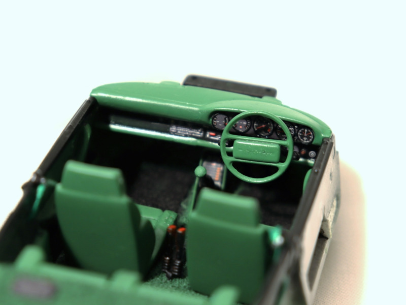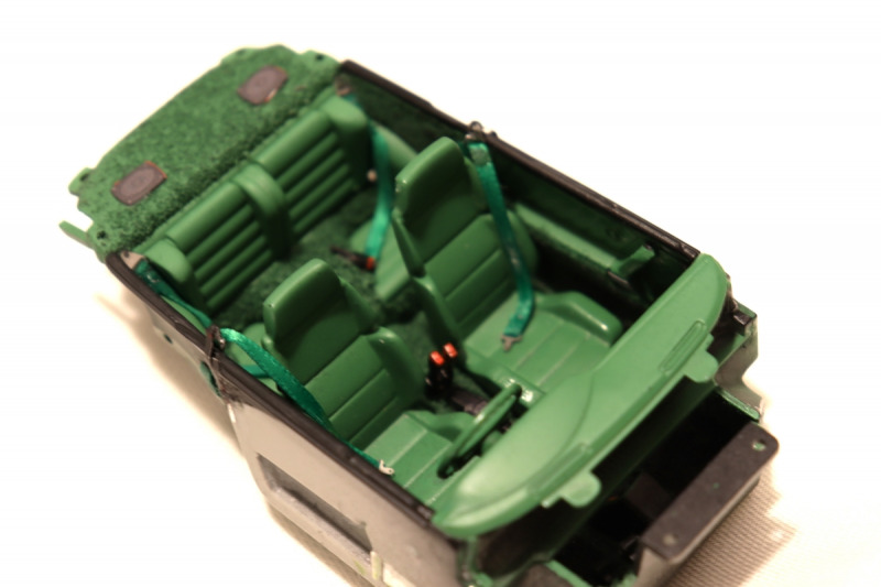 Der Motor wurde zusamengebaut und mit entsprechenden Leitungen verfeinert. Den Innenraum habe ich mit Teilen von Scaleproduction verfeinert, u.a. die Gurte in Wunschfarbe sowie geätzte Gurtschnallen hinzugefügt. An den entsprechenden Stellen im Fahrgastraum wurde Flock aufgetragen und diese - wie auch die Armaturen - nach eigenem Wunsch farblich gestaltet. Im Kit ist die Option gegeben, das Lenkrad links oder rechts einzubauen. Da ich mich für einen Engländer entschieden habe, mussten die Scheibenwischer ebenfalls zur rechten Seite ausgerichtet und entsprechend umgebaut weren. Das wurde im Kit von Revell leider nicht bedacht und ich bin erst durch weiteres Fotostudium darauf gekommen.