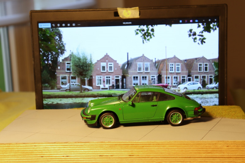 Zu guter Letzt wurde das Modell auf eine Platte gestellt und mit verschiedenen Fotohintergründen fotografiert. Wie auf den Fotos zu sehen ist, spiele ich gern mit den Hintergründen, was am besten bei Tageslicht funktioniert.