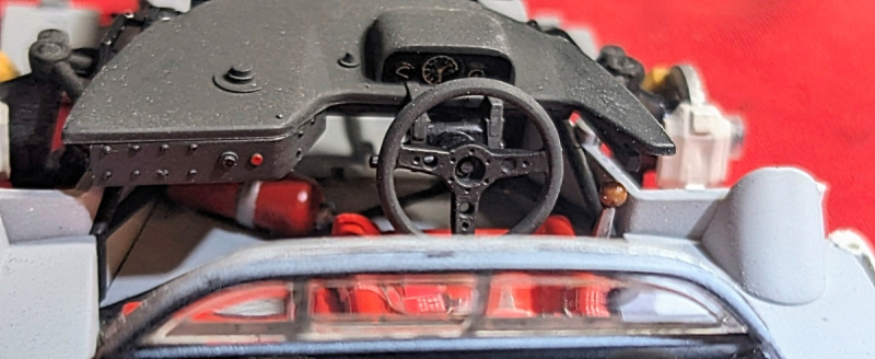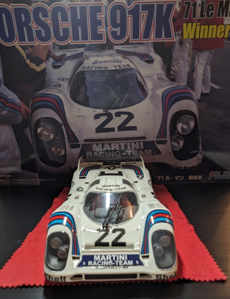 Vom Bauumfang bzw. von den Details hätte ich mir mehr erwartet, wie z.b. die Renngurte im Fahrersitz, die hab ich mir zusätzlich von Tamiya geholt, die gab es in verschiedenen Ausführungen, Rot, Blau usw. Auch vom Motor-Ausbau, diesen hätte ich detaillierter erwartet, und hab mir an Hand vom Internet was zusammengebaut. Da musste ich mir auch was einfallen lassen, wie man sieht an Hand der Bilder, sollte die Haube zum Motorraum abnehmbar sein, um das Innere bewundern zu können. Hoffe, dass ist mir etwas gelungen. Ansonsten hat es Spaß gemacht, an dem Modell zu arbeiten, wo es auch so viele Ausführungen gibt von dem Porsche 917k wie z.b. mit Lufthutzen/ohne Lufthutzen, großen Spoiler/kleinen Spoiler, Glasdach/kein Glasdach... Wahnsinn!