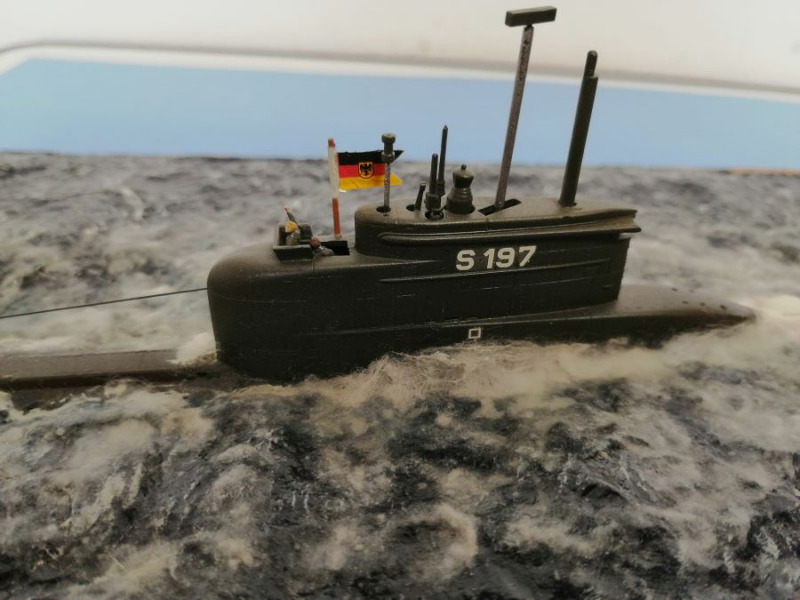 Die Wasserbase......besteht aus Styrodur, in das ich die Vollrumpfmodelle eingearbeitet habe. Die Wasserfläche habe ich aus Alufolie modelliert und sie dann mit mehreren Lagen Toilettenpapier weicher gemacht. Diese Fläche wurde dann nach dem Trocknen grundiert und mit Farbe versehen. Die Gischt besteht aus Watte, die ich am Schluss mit Acryl-Gloss eingearbeitet habe. Viel Spaß mit den Bildern!
