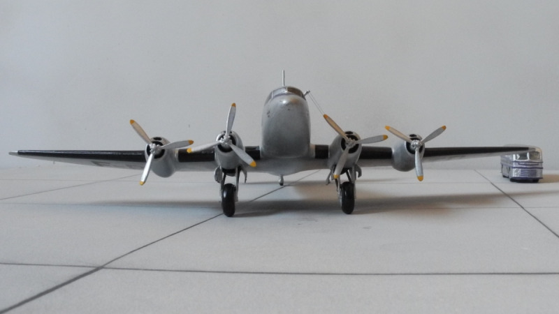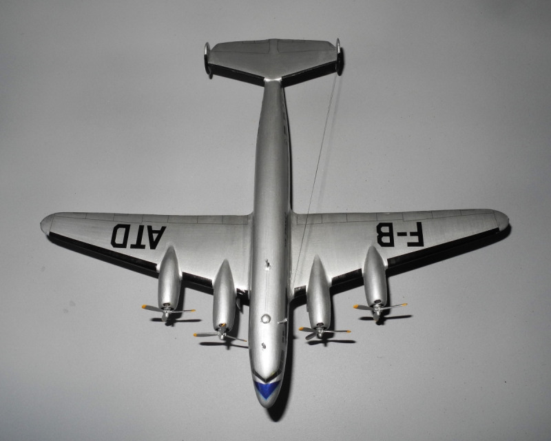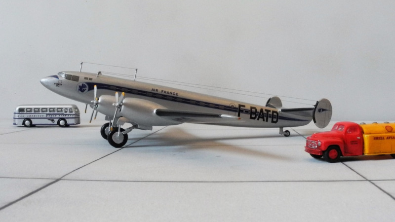 Der Ersteinsatz der Air France-Maschinen erfolgte ab dem 28. Mai 1946 zunächst auf der Strecke zwischen Paris und Algier, später folgten Strecken innerhalb Europas. Nachdem sich Probleme mit dem Antrieb und dem Fahrwerk ergeben hatten, wurden die Flugzeuge im Oktober abgestellt und ab 1947 mit neuen Motoren und der neuen Bezeichnung SE.161.P7 wieder in Dienst gestellt. Die Nachrüstung mit einer Enteisungsanlage und einer Kabinenheizung machte sie erstmals wintertauglich. Der Einsatz erfolgte von nun an auf innereuropäischen Strecken. Aus Wikipedia, wo man auch die technischen Daten nachlesen kann. Die F-BATD wurde von 1946 bis 1954 von der Air France verwendet, 1956 an die spanische Aviaco verkauft, die sie als EC-ANQ einsetzte. Wenn man der Übersicht auf https://asn.flightsafety.org/asndb/type/s161 glauben darf, war sie eine jener glücklichen Languedocs, die in keinerlei Unfälle verwickelt war. Mein ModellMein Modell entstand aus einem Resinbausatz von F-RSIN, und das ist auch schon wieder ein paar Jahre her. Wer die frühen F-RSIN-Bausätze kennt, weiß, dass es da einige "Unwägbarkeiten" gibt: Die Teile und die Bauanleitung. Letztere hat mich dazu verleitet, die beiden Hauptfahrwerke verkehrt herum einzubauen, also achterne Teile nach vorne. Und das verwendete Loctite hält auch nach vielen Jahren noch so fest, wie es die Werbung verspricht. Die Form der Seitenleitwerke sieht auch anders aus als auf den jetzt im Internet angebotenen Bildmaterial. Die Antennenanlage dürfte auch öfters modernisiert worden sein, die von mir dargestellte ist ein eher früher Zustand.