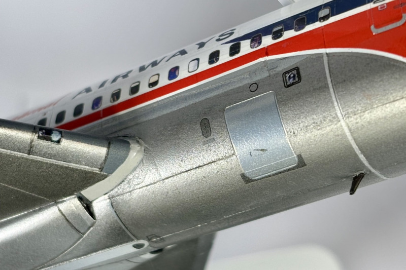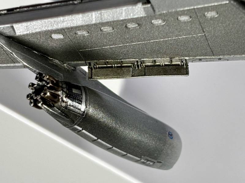 Lackiert wurde überwiegend mit Mr. Paint und Ammo of Mig Acrylfarben. Ein kleines Malheur ist mir an den Triebwerkspylonen passiert: Die Grundfarbe war Ammos Steel, darauf kamen Decals für die Wartungsdeckel und anschließend Mr. Paint Glossy Varnish. Letzteres hat die unbedeckte Acrylfarbe deutlich abgedunkelt, wodurch die Pylone nun leicht „würfelig“ im Finish wirken. Die Decals der Livery stammen von Flying Colors. Der Druck ist wirklich hervorragend, allerdings waren die Decals altersbedingt bereits brüchig. Trotz Versiegelung des Trägerbogens mit Klarlack sind insbesondere die großen blauen und roten Bereiche an der Flugzeugnase gebrochen. Hier musste ich mit Farbe, Schleifpapier und Decalresten nacharbeiten, was jedoch nicht vollständig perfekt gelungen ist.