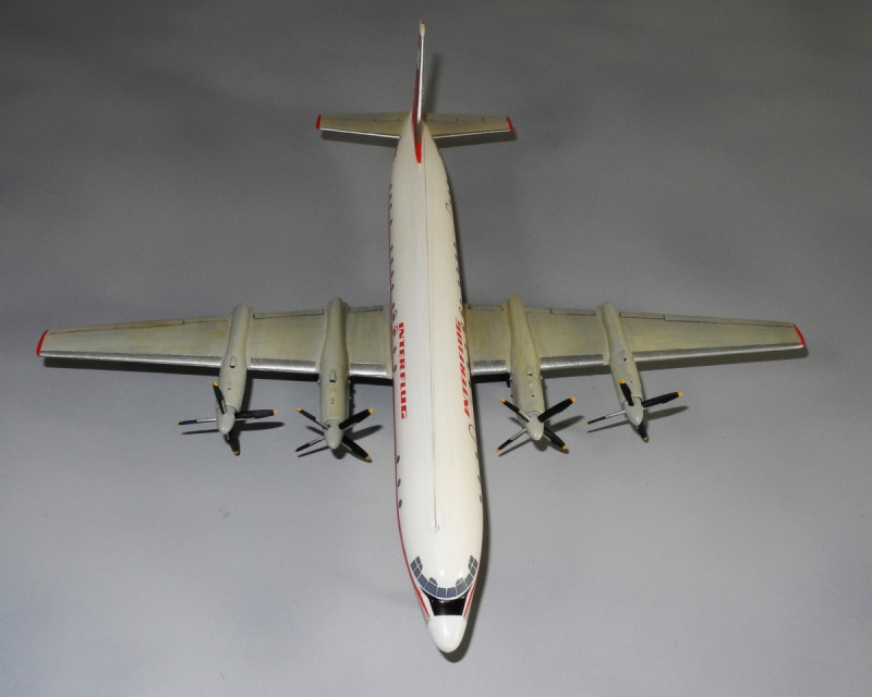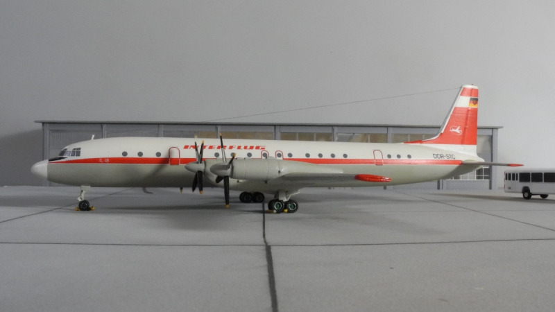 Iljuschin Il-18WDDR-STC, Interflugvon Johannes Wipauer (1:144 AZ model)Zum VorbildDieser viermotorige Turboprop-Airliner hatte im Sommer 1957 seinen Erstflug. Von 1959 bis 1978 wurden über 850 Stück hergestellt, laut Wikipedia, wo man auch die technischen Daten u.v.a.m. nachlesen kann. Dieses Design hatte mit einem ursprünglichen Entwurf aus 1946 nur das viermotorige Antriebslayout und die zivile Verwendung gemeinsam: abgesehen von der größeren Spannweite war die "Ur-IL-18" kleiner, leichter und wegen der Sternmotoren auch langsamer als die hier vorgestellte Turboprop. Eine weitere ergiebige Quelle im Web ist https://www.interflug.biz/IL-18.htm wo man auch sehr interessante historische Angaben, speziell die Interflug betreffend, nachlesen kann. Die DDR-STC wurde am 16.7.1960 an die Lufthansa der DDR übergeben, damals noch als DM-STC. Am 1.9.1963 an die Interflug überschrieben, ab 1981 fliegt sie als DDR-STC im hier dargestellten Design. 1987 wurde sie von der Interflug außer Dienst gestellt, diente noch eine Weile als Triebwerks-Erprobungsträger und wurde 1996 verschrottet. Quelle: http://www.if-interflug.de/Flotte/Verbleib/il18.html Mein ModellMein Modell entstand aus dem AZ model-Bausatz, den ich hier bereits vorstellen durfte. Ich habe eine der beiden vorgesehenen Decaloptionen (die andere wäre CSA gewesen) OOB zusammengebaut. Was ich damals nicht beachtet habe, war folgendes Detail des Bausatzes: Einige Jahre später wollte ich das fertige Modell hier präsentieren und machte noch einen "final check" wegen Antennen "und so Kleinigkeiten" - Und ich fand auf keinem der mir bekannten Vorbildfotos von IF-Maschinen diesen auffälligen Steg am Rumpfrücken. Der muss dann hier auch weg! "Hier" war das fix fertig montierte, bemalte Modell mit allen Decals. Ein Microcutter mit frischer Klinge war das am ehesten passende Operationsinstrument, hat auch gut funktioniert. Um die OP-Narbe möglichst unsichtbar zu machen, wurde mit den selben Materialien grundiert und lackiert, wie der übrige Rumpfrücken. Dazu mußten Decals und andersfärbige Teile sicher geschützt werden. Wie man sieht, ist alles gut gegangen. Als Belohnung bekam der "geduldige Patient" dann noch eine Antenne aus "Rig that thing":