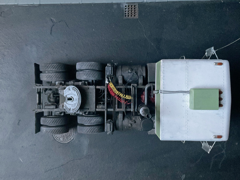 Als Motor wollte ich eigentlich einen Detroit Diesel 6-71 Reihensechszylinder verwenden, aber leider war der nicht zu bekommen. Somit verwendet ich den V6 Detroit Diesel 6V71 Kit mit Getriebe von Strato Models. Das Getriebe des Kits passt eher zu einem Conventional als zu einem COE, so dass ich dieses gegen ein Fuller 13 Gang Roadranger für eine COE tauscht. Druckluft- und Dieselleitungen am Rahmen, Motor und Getriebe wurden zusammen mit verschiedenen Ventilen und Verschraubungen von CTM dargestellt. Die Sattelplatte aus einem amt Bausatz wurde um die Verriegelung und neuen Zahnstangenprofil aus dem Drucker verfeinert. Die Leitungen mit den Kupplungen zum Trailer sind von CTM. Damit Trailer und Truck leichter verbunden werden können, wurden 1x1 mm große Magnete an den Kupplungsstücken verwendet. Lackiert wurde alles mit Farben von Zero Paints. Bei Zero Paints gibt es neben dem Detroit Diesel Green auch Farbtöne für Caterpillar, Ford, GM, Chrysler Motoren. Die Alterung erfolgt mit verschieden Farbtönen, Pigmenten und Washes von AMMO bzw. AK Interactive.