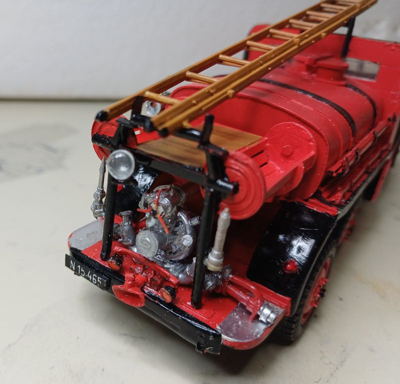 Das damalige Mekka des Plastikmodellbaues in Wien, Hobby Sommer in der Neubaugasse, bot diese Pläne ebenfalls wohlfeil. Außerdem ist bei Spielberger ebenfalls ein Plan des ADG mit Maßangaben vorhanden. Ein Anruf beim Kommandanten der FF Aspang genügte und ich bekam einen Fototermin, an diesem Tag war auch das Team von „Brand aus“ anwesend, welches den Artikel verfasste, wobei ich zum Fachsimpeln Gelegenheit hatte. Somit stand dem Bau nichts mehr im Wege. Warum aber das Fahrzeug hinten einfach bereift war, konnte man mir nicht sagen. Fertig, aber noch nicht voll ausgerüstet