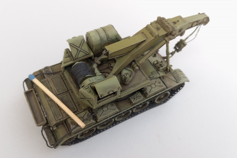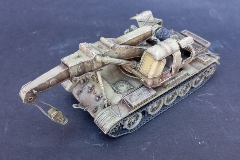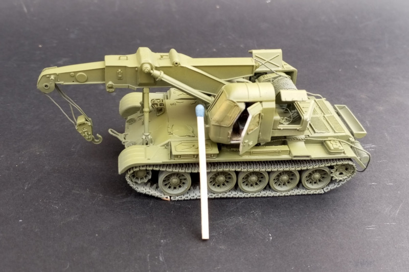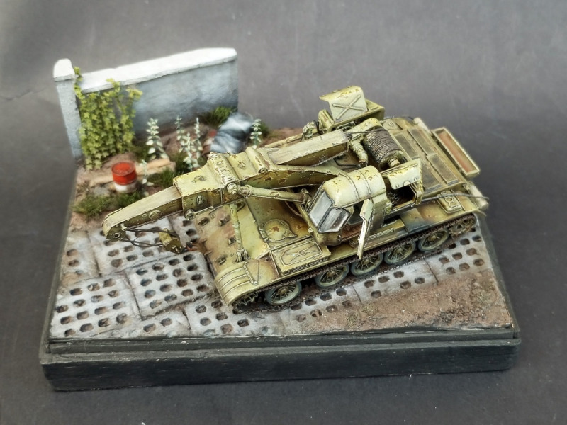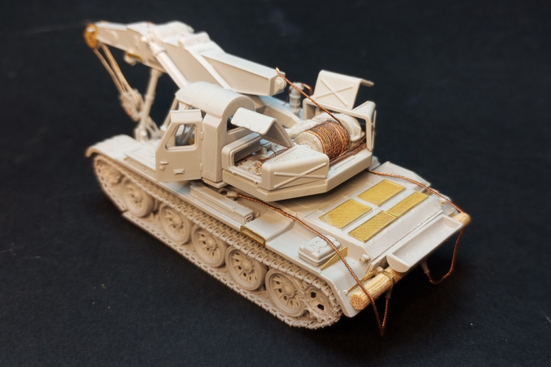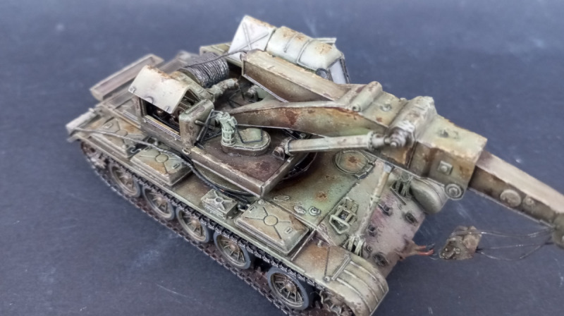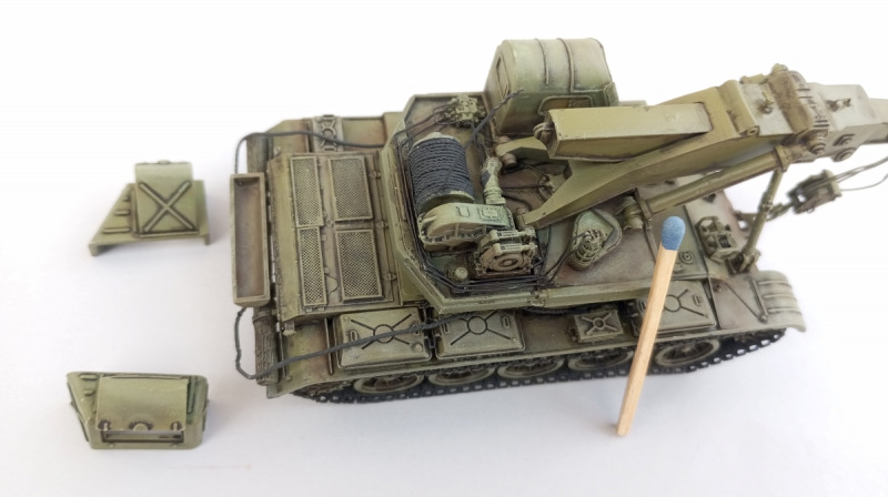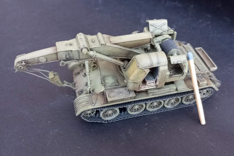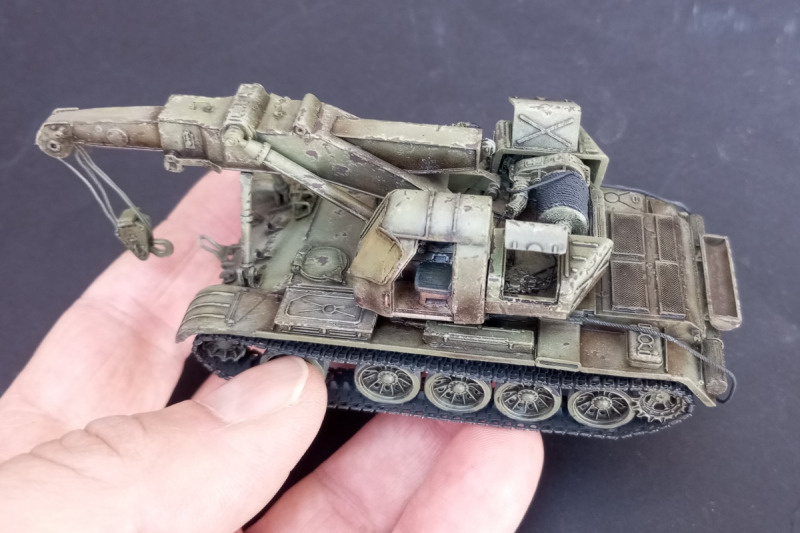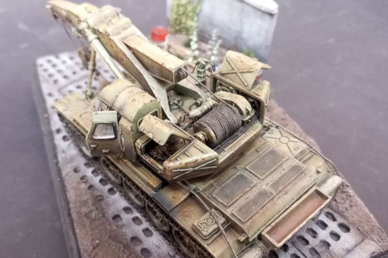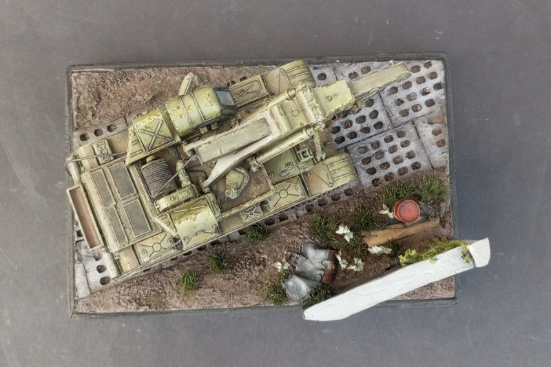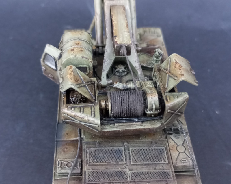 Die Bauanleitung enthält auch eine Zeichnung über die Position und Anschlüsse der Hydraulikschläuche, was eine sehr große Hilfe ist, da Fotos und Informationen zum Fahrzeug im gesamten Internet schwer zu finden sind. Das Modell wurde OOB gebaut. Ich habe lediglich die Kabel aus Kupferdraht gefertigt und den Holzstamm durch einen zugeschnittenen Bambusspieß ersetzt. Ich habe das Modell mit den üblichen Acrylfarben in „Russischgrün“ bemalt. Nach dem Emaille-Pinwash habe ich das Fahrzeug mit Ölfarben gealtert.
