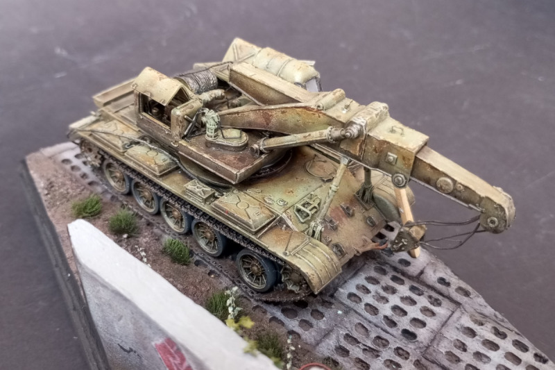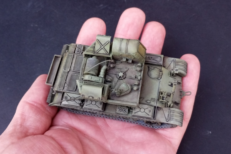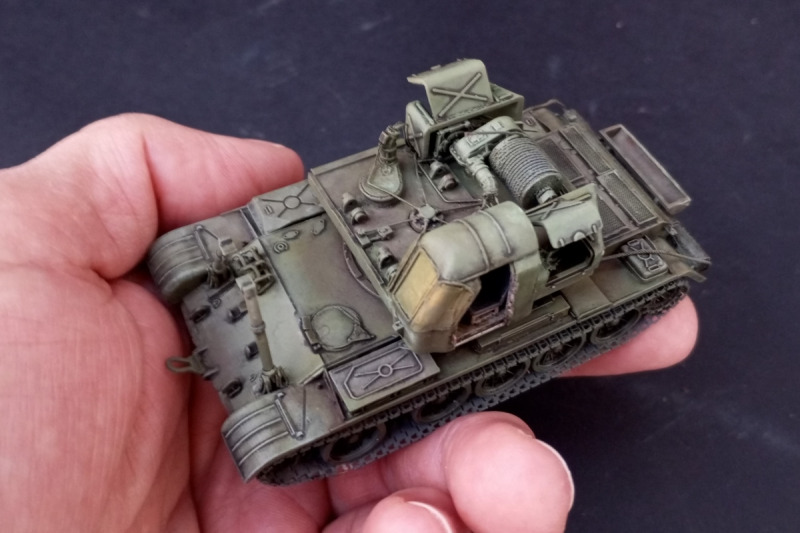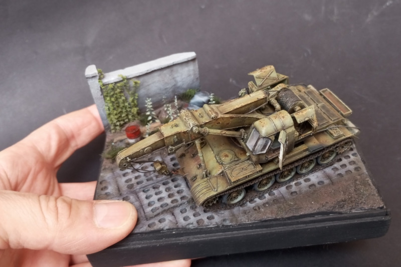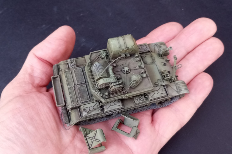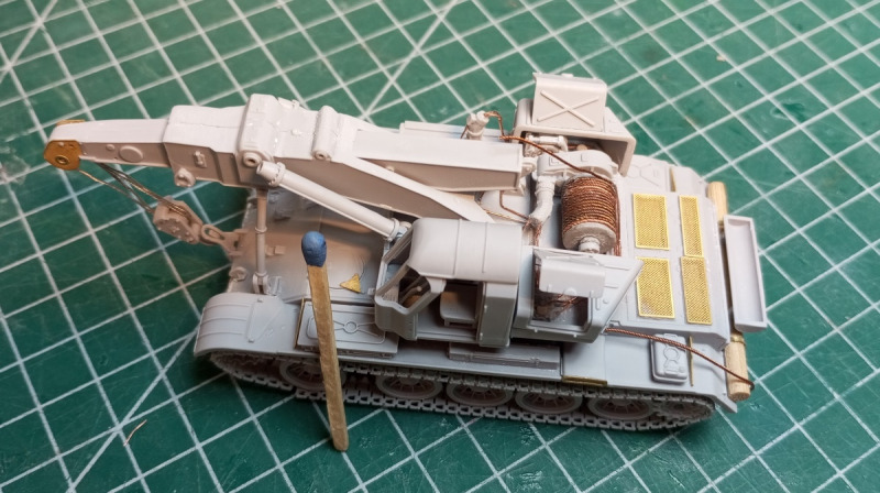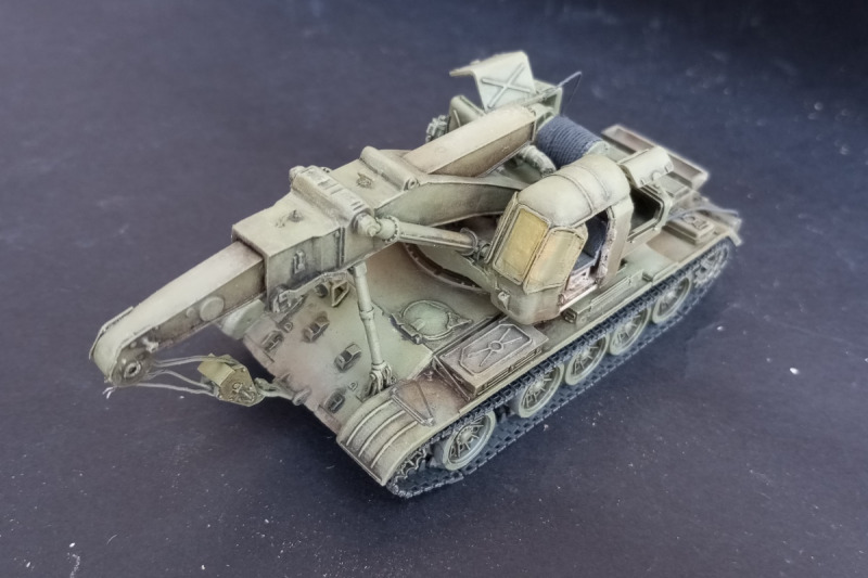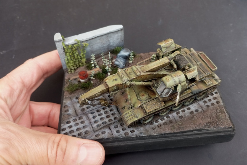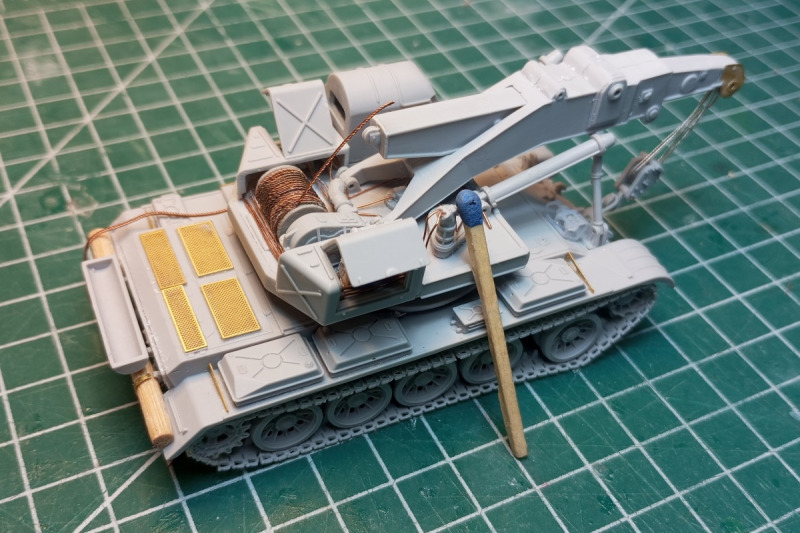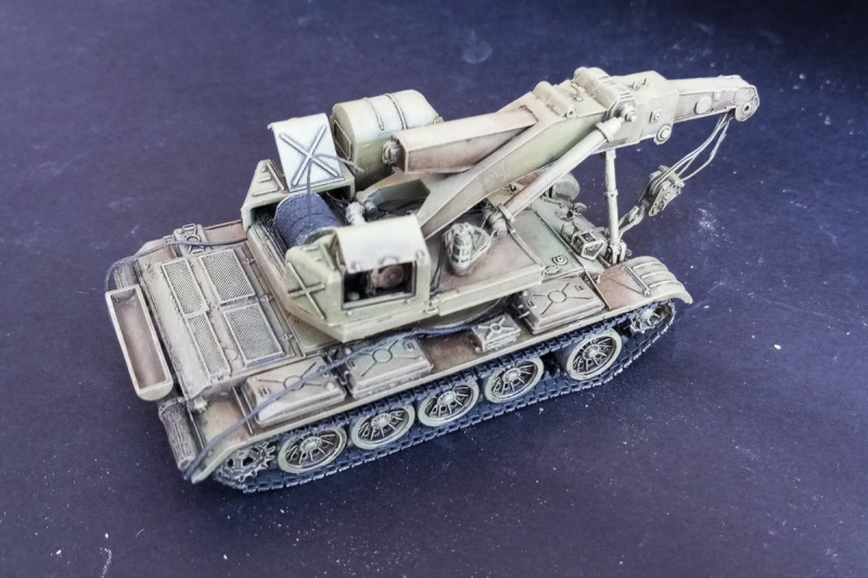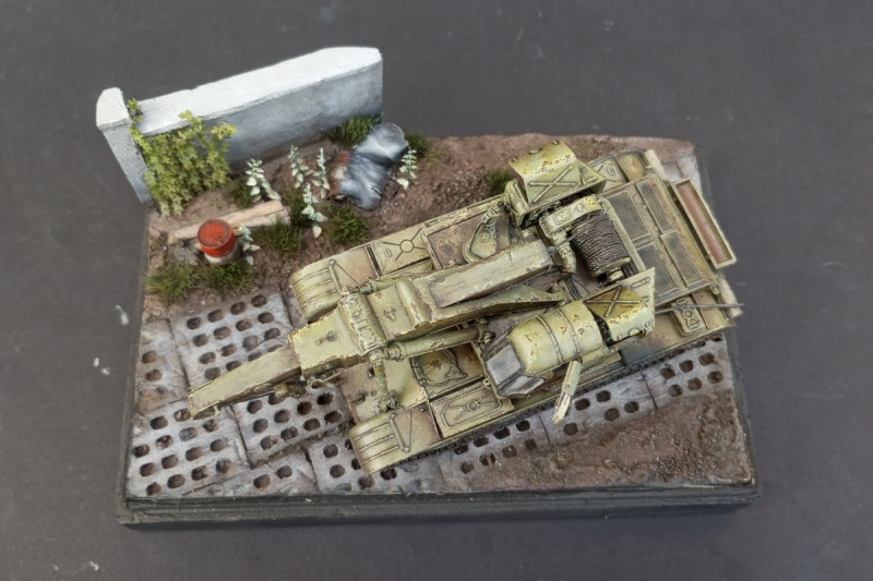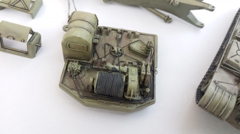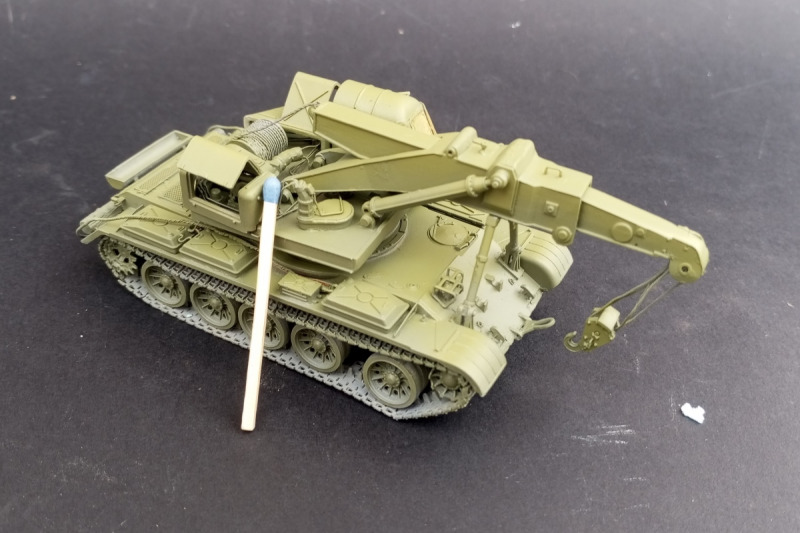 Die Bauanleitung enthält auch eine Zeichnung über die Position und Anschlüsse der Hydraulikschläuche, was eine sehr große Hilfe ist, da Fotos und Informationen zum Fahrzeug im gesamten Internet schwer zu finden sind. Das Modell wurde OOB gebaut. Ich habe lediglich die Kabel aus Kupferdraht gefertigt und den Holzstamm durch einen zugeschnittenen Bambusspieß ersetzt. Ich habe das Modell mit den üblichen Acrylfarben in „Russischgrün“ bemalt. Nach dem Emaille-Pinwash habe ich das Fahrzeug mit Ölfarben gealtert.