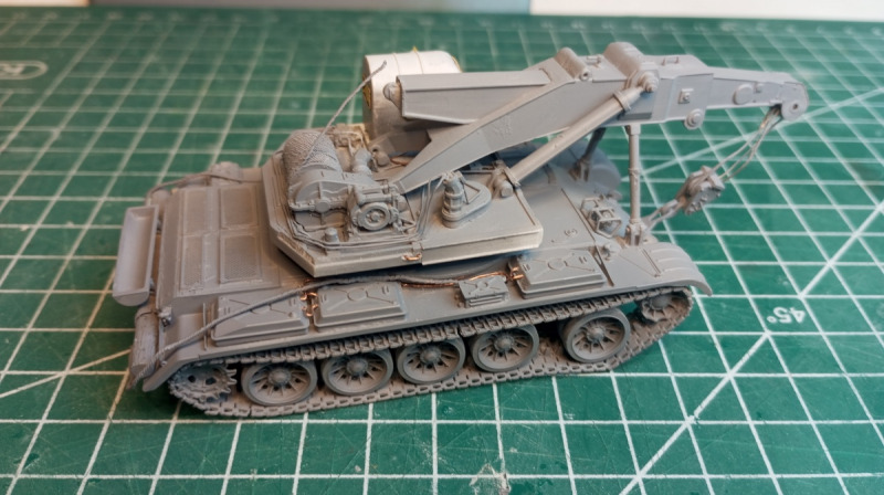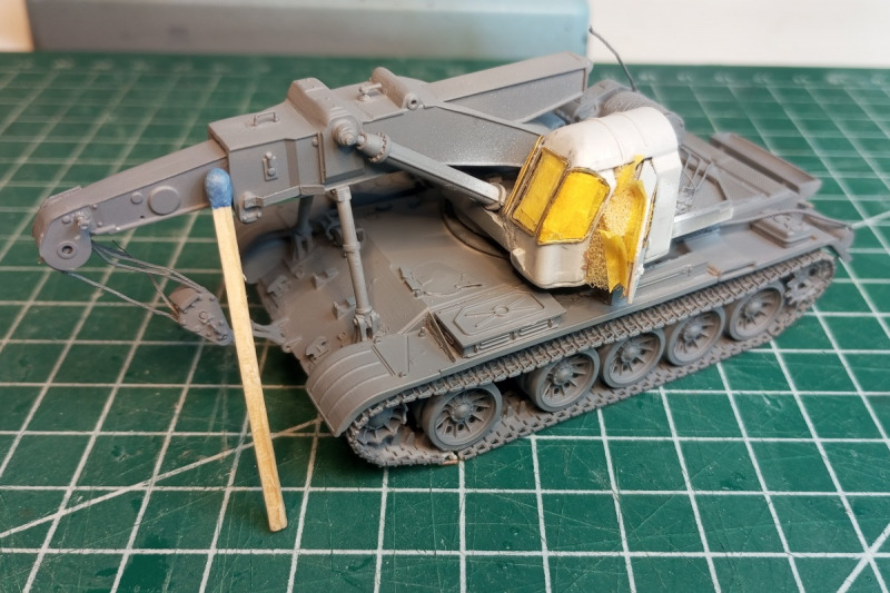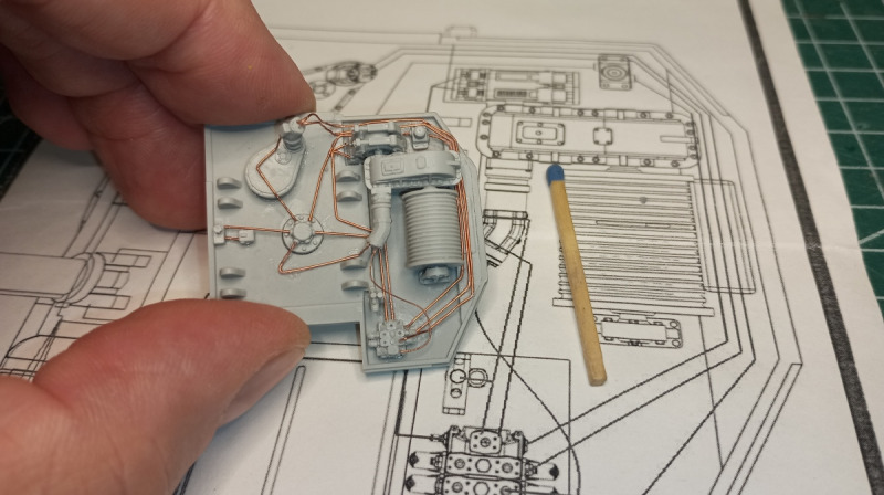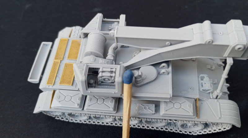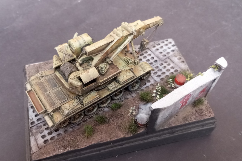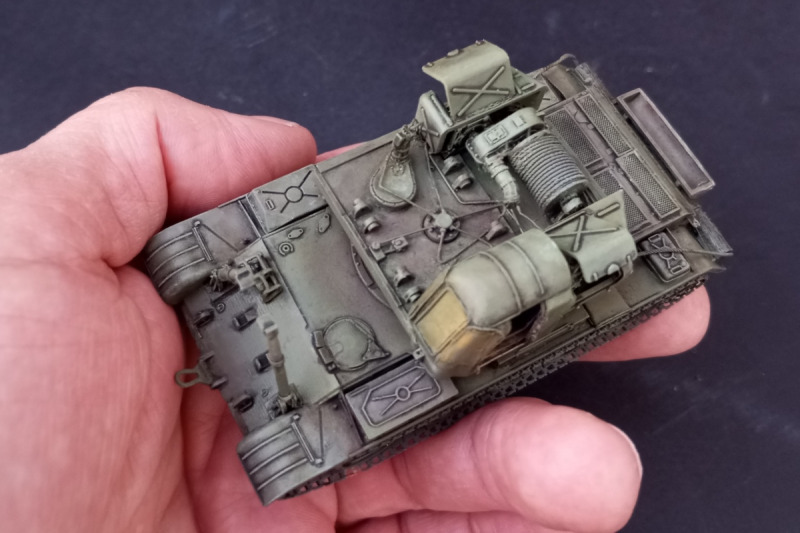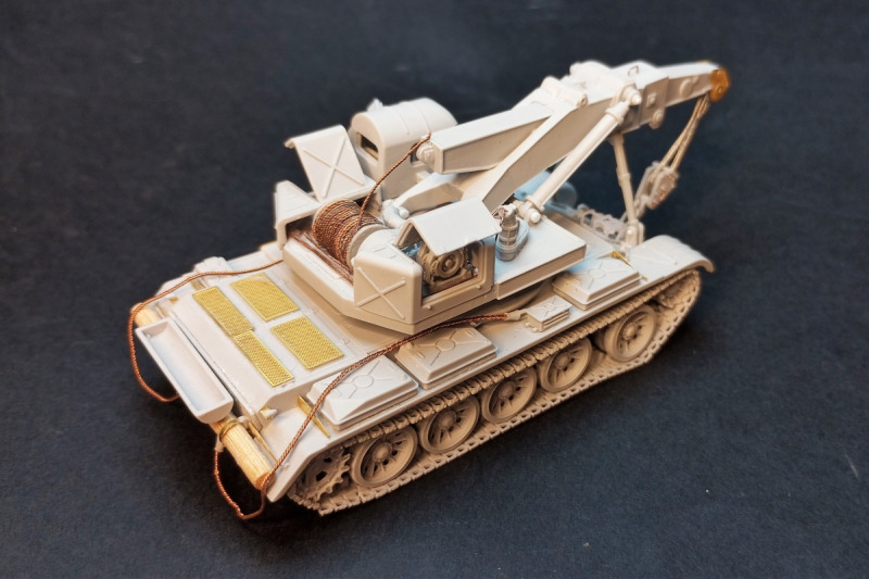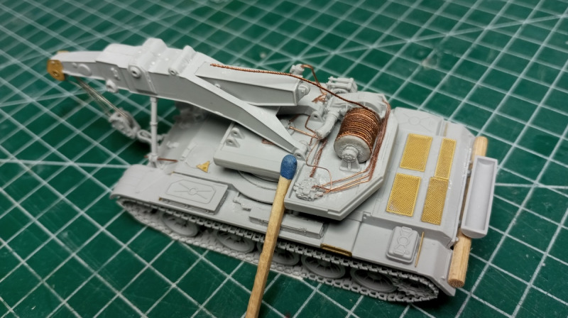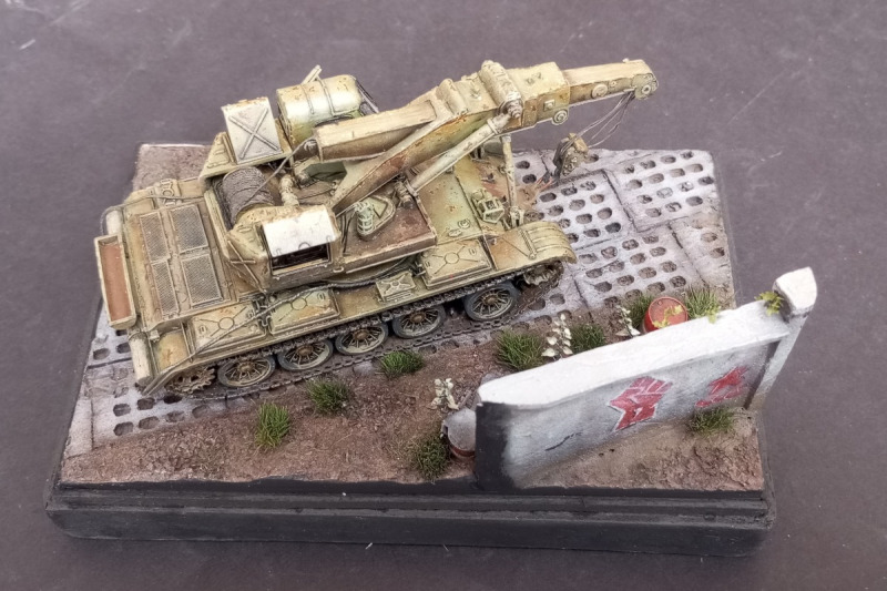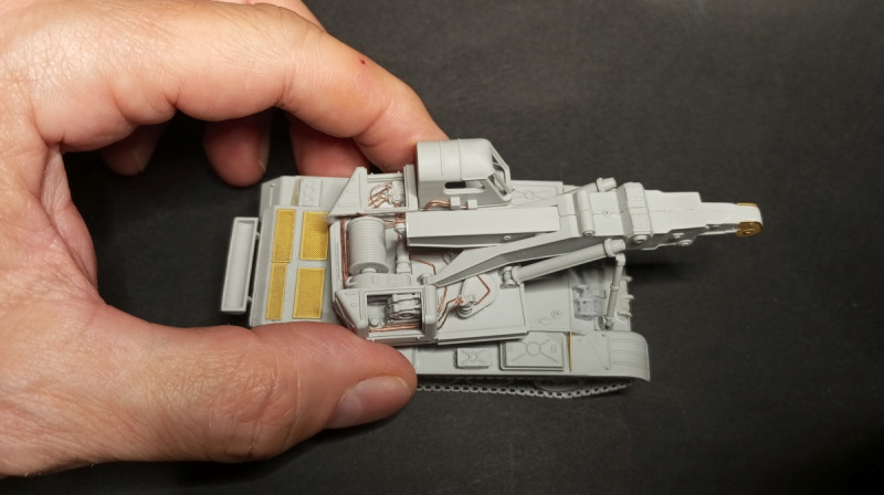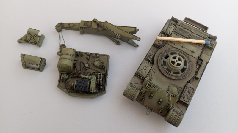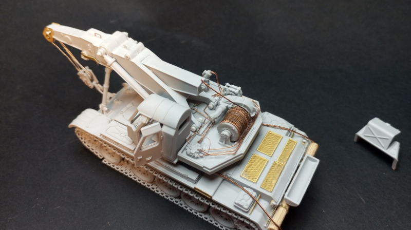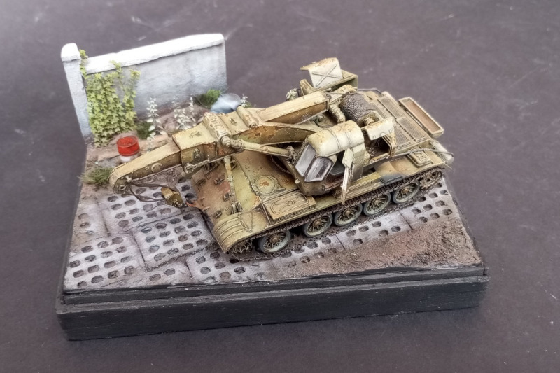 Die Bauanleitung enthält auch eine Zeichnung über die Position und Anschlüsse der Hydraulikschläuche, was eine sehr große Hilfe ist, da Fotos und Informationen zum Fahrzeug im gesamten Internet schwer zu finden sind. Das Modell wurde OOB gebaut. Ich habe lediglich die Kabel aus Kupferdraht gefertigt und den Holzstamm durch einen zugeschnittenen Bambusspieß ersetzt. Ich habe das Modell mit den üblichen Acrylfarben in „Russischgrün“ bemalt. Nach dem Emaille-Pinwash habe ich das Fahrzeug mit Ölfarben gealtert.