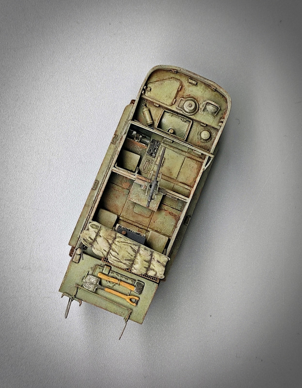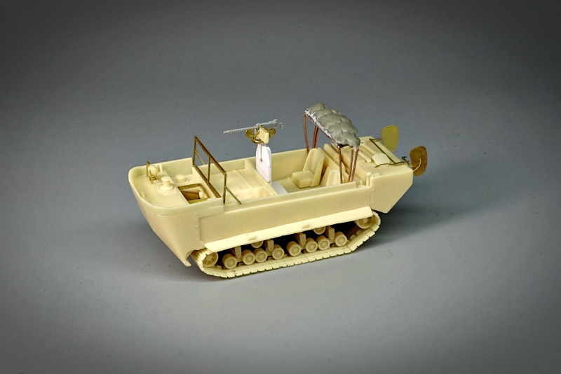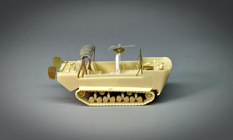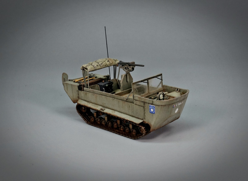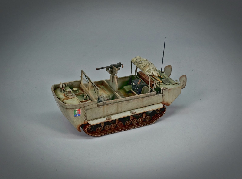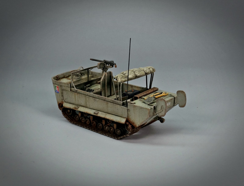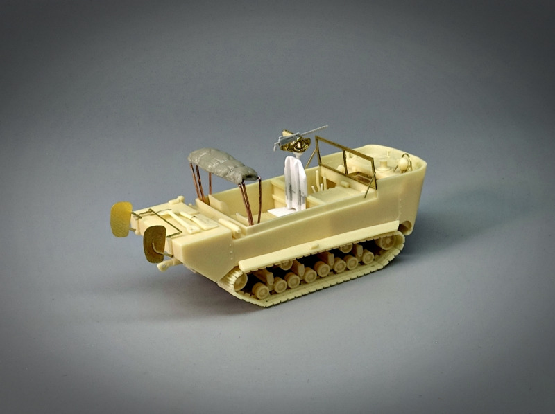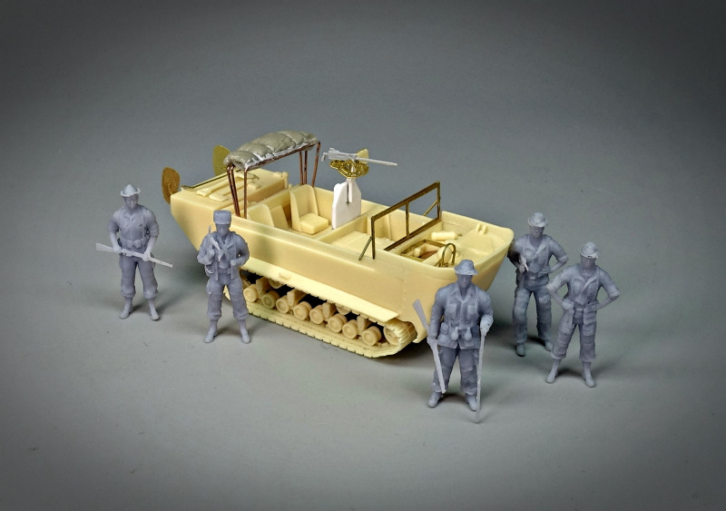 Der BauDer Anfang bestand in der Entfernung der üppigen Angussblöcke, sowie das Versäubern der Resin-Einzelbauteile. Ein zum Teil mühseliger Arbeitsschritt, der sich gerade bei Resinbausätzen nur selten vermeiden lässt. Da die Seitenschürzen (Bauteile 9 und 10) gerade in Indochina kaum Verwendung fanden, dementsprechend eingeklappt oder komplett demontiert wurden, musste dies auch beim Bau berücksichtigt werden. So trennte ich mit Hilfe eines Skalpells die Schürzen von der Halterungsschiene und montierte nur diese am Rumpfteil (Bauteil 1). Als wirklich kniffelig gestaltete sich der Zusammenbau des Kettenlaufwerks. Hier war ganz genaues Arbeiten angesagt, um keine bösen Überraschungen zu erleben. Eigentlich bevorzuge ich es, einen Bausatz zwecks besseren Handlings bei den Lackierungsarbeiten in verschiedene Baugruppen aufzuteilen. Doch schien mir diese Arbeitsweise bei diesen Kit und der Aufteilung des Laufwerks als kontraproduktiv, so dass ich hier eine komplette Montage vor der Lackierung ins Auge fasste. Bei der Windschutzscheibe wich ich von der Bauanleitung ab. So sollten die beiden Ätzteile 11 und 12 beidseitig mit einer Klarsichtfolie verklebt werden. Ein Arbeitsschritt, der bei den folgenden Lackier- und Alterungsarbeiten für Komplikationen sorgen konnte. Also verzichtete ich auf die Klarsichtfolie und montierte direkt die beiden Ätzteile. Zwei passend zurecht geschnittene Folien sollten erst nach Abschluss aller anderen Arbeiten zum Ende mit den Scheibenwischern eingeklebt werden. Da ich mich für den Bau der französischen „Crabe“-Version entschieden hatte, mussten nun noch einige Upgrades vorgenommen werden. So gestaltete ich aus einer eingerollten Plane aus der Restekiste und Kupferdraht das Verdeck im zusammengeklappten Zustand. Aus Plastiksheet und Teilen aus der allseits bekannten Restekiste fertigte ich den MG-Stand im mittigen Bereich des M29. Zwar beinhaltet der Bausatz die Möglichkeit zur Gestaltung dreier Sitzmöglichkeiten im Heckbereich, doch verzichtete ich auf den mittigen Sitz und platzierte stattdessen dort eine Funkanlage, die eigens von uns im 3D-Druck gestaltet worden war. Zwar zeigen viele Originalbilder im Bugbereich einen dünnblechigen Aufbau auf, doch konnte ich mich damit nicht wirklich anfreunden. So störte es in meinen Augen das Gesamtbild. Zu gute kam mir, dass dieser Aufbau nicht immer Verwendung fand. So konnte ich guten Gewissens darauf verzichten.