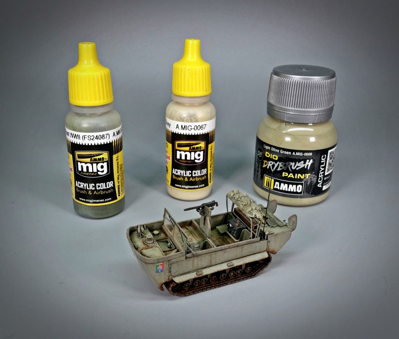 Die Hauptkomponenten der Farbgebung Die LackierungAls Basis diente mir hier ein „US Olive Drab Post WW2“ von Ammo/ Mig (A.MIG-081), welches ich immer wieder punktuell mit einem „Sand grey“ (A.MIG-0067) aufhellte, um eine gewisse Tiefenwirkung zu verstärken. Anschließend folgte ein kräftiges Drybrushing mit einem hellen Grün (A.MIG-0608), um diesen Effekt weiter zu verstärken. Auch alle anderen kleineren Farbarbeiten erfolgten nun mit dem Pinsel. Nachdem alle allgemeinen Farbarbeiten erledigt waren und das ganze Modell eine Vollversiegelung mit Glanzklarlack erhalten hatte (Vallejo 70.510), konnten nun die Decals aufgebracht werden. Dabei griff ich auf einen Decalbogen von Star Decals zurück (72-A1028), der sich auf verschiedene Fahrzeuge der Franzosen im Indochina-Krieg bezieht. Nach Aufbringung der Decals und anschließender Versiegelung mit Klarlack, konnte man sich nun mit der Alterung befassen. Die AlterungDa ich nicht in Erfahrung bringen konnte, ob der Rumpf des M29 in Leichtbauweise aus Aluminium gefertigt worden war, arbeite ich eher dezent mit Rostfarben und brachte diese nur dort zum Einsatz, wo auch beim Original am meisten mit Verschleiß und Korrosion zu rechnen gewesen war. Mehr Augenmerk legte ich dagegen auf Wetterschlieren. Hier arbeitete ich mit verschiedenen Grüntönen (unverdünnte Ölfarbe), die ich mit einem gekürzten Pinsel vertikal abstrich und bearbeitete, bis ich mit dem jeweiligen Ergebnis zufrieden war. Als nächstes folgte ein dunkelbraunes, punktuelles Washing, welches ich mit einem dezenten sandfarbenen Drybrushing (Revell 89) optimierte. Zu guter Letzt folgten die Filter. Während ich am ganzen Modell ein „Tan for tritonal Camo“ setzte (MIG F242), kam auf den horizontalen Flächen zum Teil ein „Sun Bleach“ (F430) zum Einsatz. Anschließend musste das ganze Modell nur noch mit einem matten Finish (Vallejo 69.702) versiegelt werden. Nach einer ausreichenden Trocknungszeit war nun die Zeit für die Pigmente gekommen, die vorwiegend im Fahrwerksbereich und Laufketten zum Einsatz kamen. Die Hauptkomponenten spielten dabei ein „Vietnam Earth“ (MIG P031) und ein „Dark Mud“ (MIG P033), die ich mit Hilfe von White Spirit in den erwähnten Bereichen aufbrachte. Beide Pigmente sollten auch im späteren Diorama zum Einsatz kommen. Da ich eine „Crabe“ darstellen wollte, die erst kürzlich dem Wasser entsprungen war, gestaltete ich den unteren Bereich des Modells nass/ feucht. Dabei griff ich auf „Wet Effects“ (MIG P409) zurück, welches ich großzügig im Kettenbereich und Umfeld aufbrachte. Zwar schluckten die Pigmente zum Teil diesen Nass-Effekt, doch wirkte das Gesamtergebnis absolut zufriedenstellend. Nun mussten nur noch die Scheiben inklusive Scheibenwischer montiert und ein wenig verschmutzt werden. Eine aus dünnen Federstahl gefertigte Funkantenne markierte dann den Abschluss am Modell.