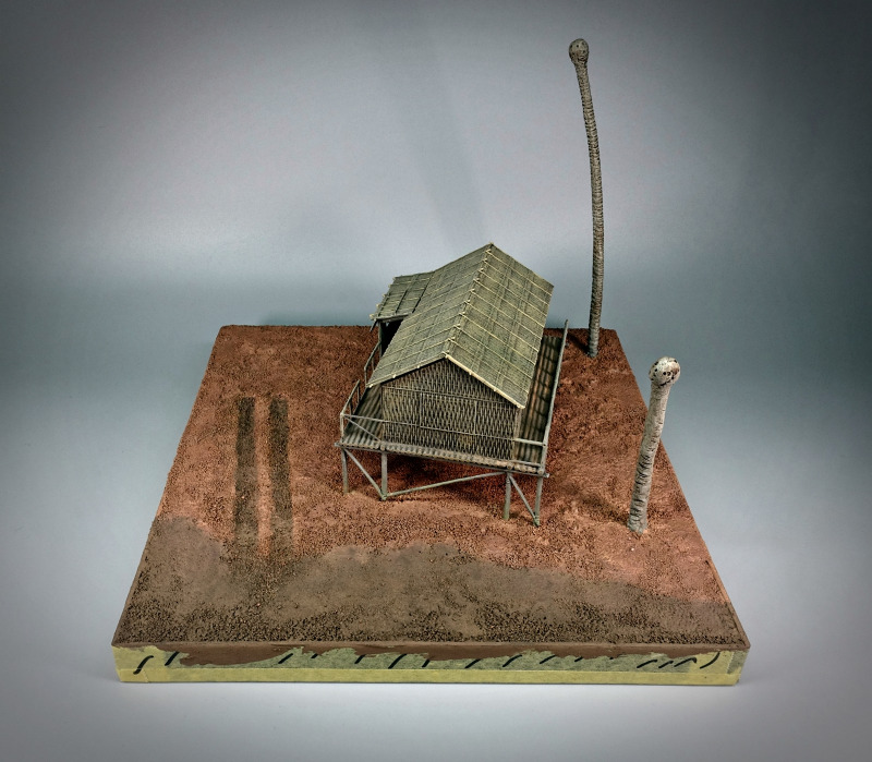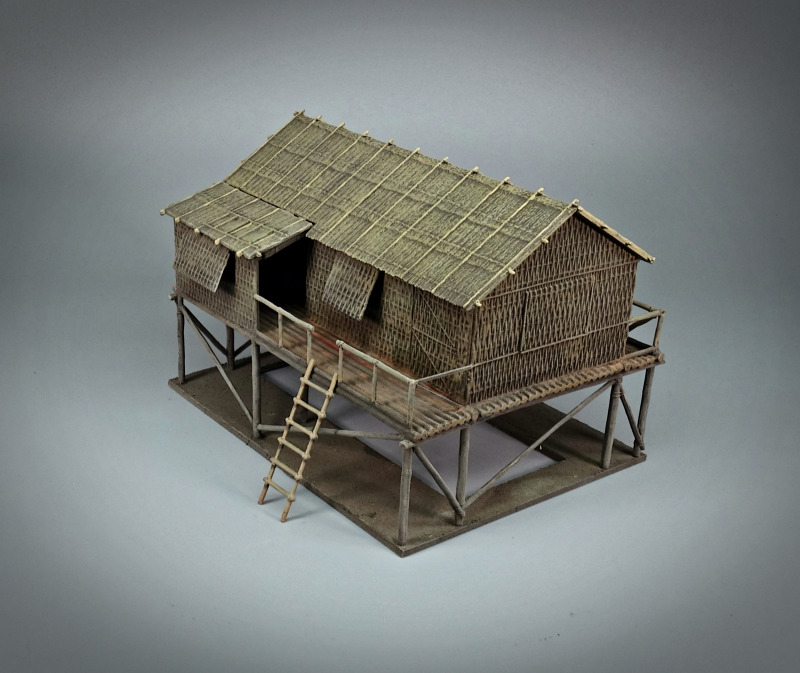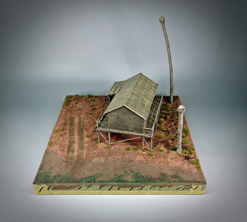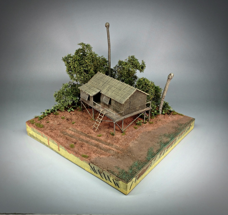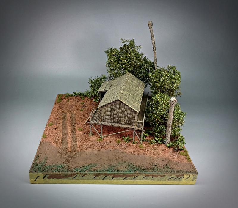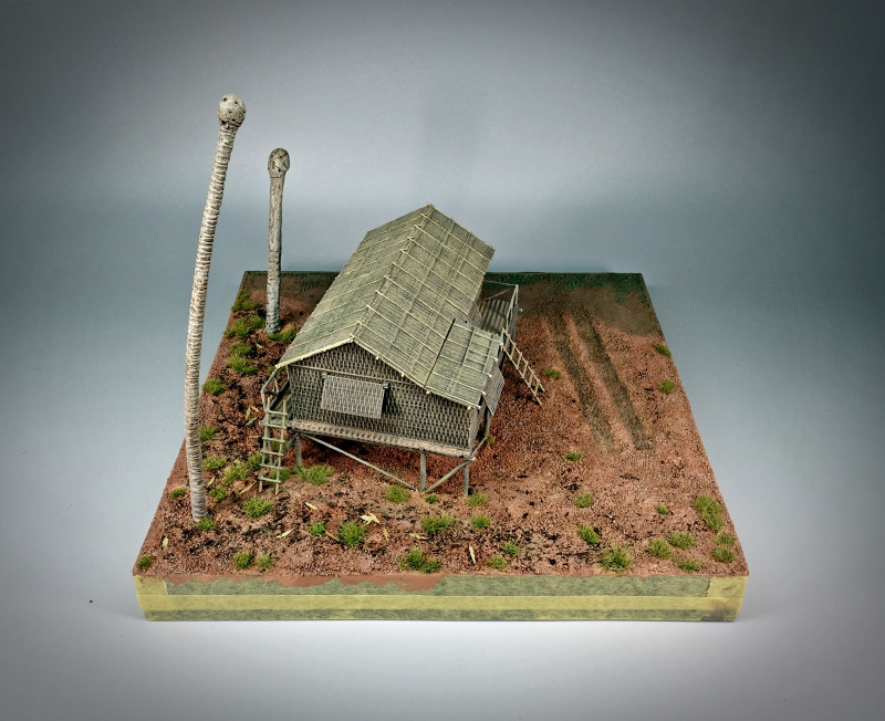 Das DioramaWie bei all meinen Projekten, hatte ich schon zu Beginn der Arbeiten ein gewisses Bild vor mir, wie der M29 im Diorama „wirken“ sollte. Ein wenig Wasser, üppige Vegetation und eine passende Buschhütte sollten hier die Hauptkomponenten bilden. Um die genauen Proportionen/ Ausmaße des Dioramas bestimmen zu können, galt das erste Augenmerk der Buschhütte. Nach langen Suchen und Überlegen griff ich hier auf die Hütte des „Jungle Outpost“-Sets von Airfix zurück. Der erste Blick war hier alles andere als vielversprechend. Kein Wunder, immerhin erblickte dieser Set schon im Jahr 1977 das Licht der Modellbauwelt. Dementsprechend betagt erschienen auch die jeweiligen Bauteile. Einen Innenstruktur war quasi nicht vorhanden und auch die eigentlichen Außenstrukturen schienen nicht mehr zeitgemäß. Trotz alle dem und zu dem Zeitpunkt fehlenden Alternativen war aber nun mein Ehrgeiz geweckt und es ging voller Elan ans Werk. Der Zusammenbau bereitete dabei keinerlei Probleme und war in kurzer Zeit erledigt. Einige Stellen wurden dabei von mir leicht optimiert und der vordere Leiterzugang versetzt, was der späteren Position im Diorama geschuldet war. Das Dach behandelte ich als separates Bauteil, welches erst später seinen festen Sitz auf der Hütte erhalten sollte. Um den Aufbau der Holzpfähle zu stabilisieren und damit das Handling zu verbessern, klebte ich die Hütte auf eine passend zurecht geschnittene Balsaholz-Platte. Bevor die Farbarbeiten begannen, füllte ich Ritzen der Bodenstämme mit Heilerde auf und fixierte diese mit Pigment-Fixer, um die ein wenig überzogene Bodenstruktur ein wenig zu kaschieren.