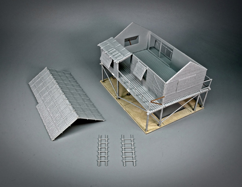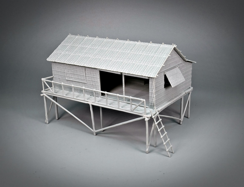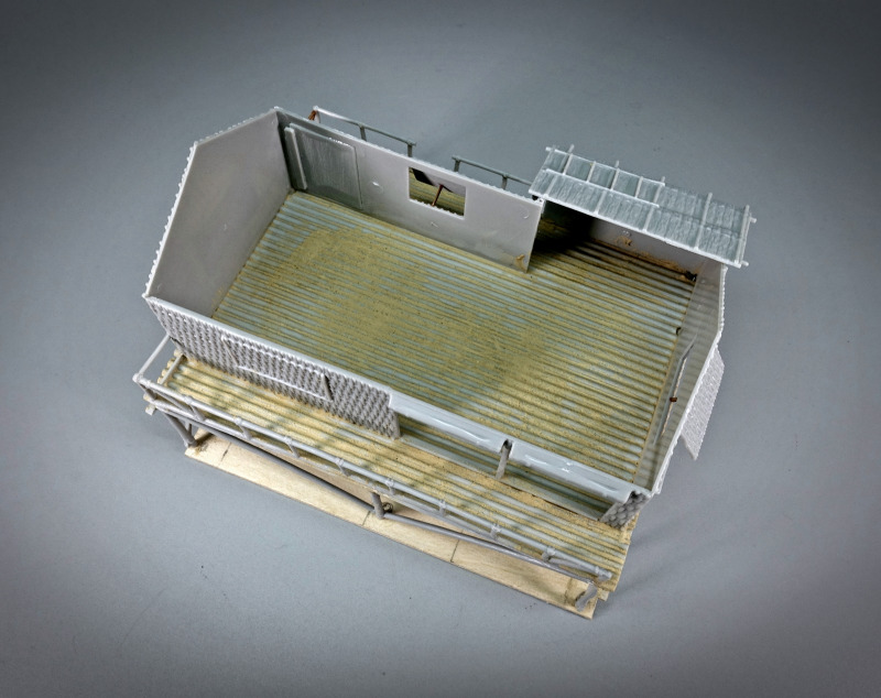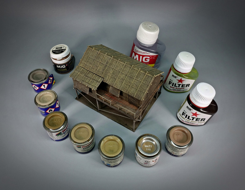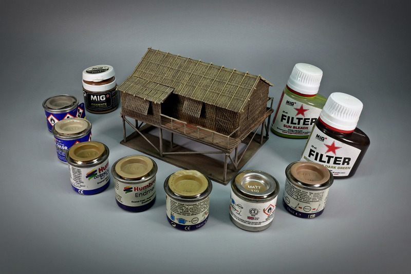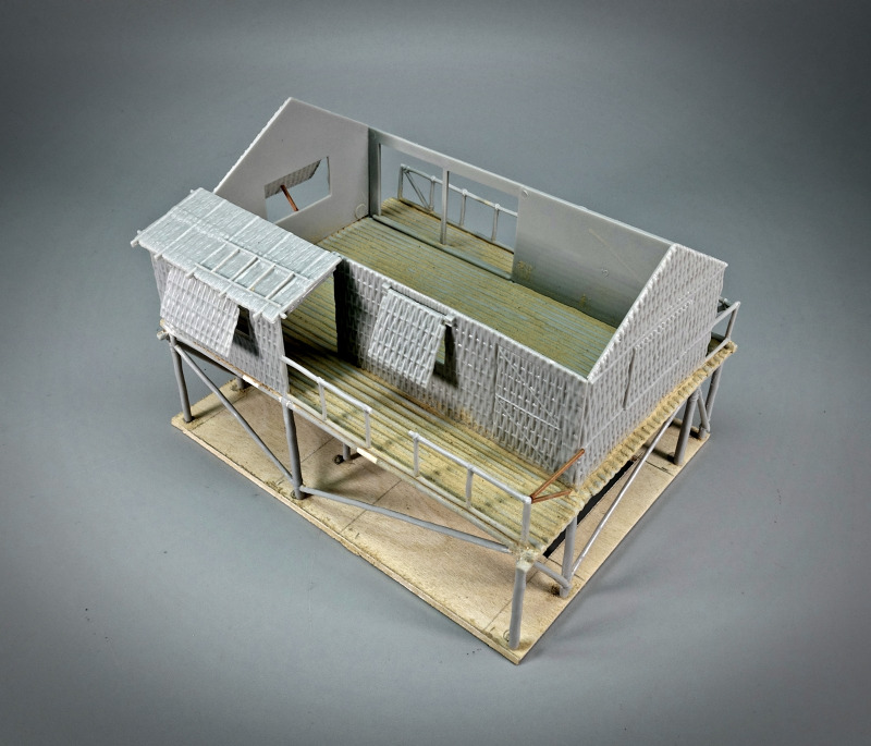 Das DioramaWie bei all meinen Projekten, hatte ich schon zu Beginn der Arbeiten ein gewisses Bild vor mir, wie der M29 im Diorama „wirken“ sollte. Ein wenig Wasser, üppige Vegetation und eine passende Buschhütte sollten hier die Hauptkomponenten bilden. Um die genauen Proportionen/ Ausmaße des Dioramas bestimmen zu können, galt das erste Augenmerk der Buschhütte. Nach langen Suchen und Überlegen griff ich hier auf die Hütte des „Jungle Outpost“-Sets von Airfix zurück. Der erste Blick war hier alles andere als vielversprechend. Kein Wunder, immerhin erblickte dieser Set schon im Jahr 1977 das Licht der Modellbauwelt. Dementsprechend betagt erschienen auch die jeweiligen Bauteile. Einen Innenstruktur war quasi nicht vorhanden und auch die eigentlichen Außenstrukturen schienen nicht mehr zeitgemäß. Trotz alle dem und zu dem Zeitpunkt fehlenden Alternativen war aber nun mein Ehrgeiz geweckt und es ging voller Elan ans Werk. Der Zusammenbau bereitete dabei keinerlei Probleme und war in kurzer Zeit erledigt. Einige Stellen wurden dabei von mir leicht optimiert und der vordere Leiterzugang versetzt, was der späteren Position im Diorama geschuldet war. Das Dach behandelte ich als separates Bauteil, welches erst später seinen festen Sitz auf der Hütte erhalten sollte. Um den Aufbau der Holzpfähle zu stabilisieren und damit das Handling zu verbessern, klebte ich die Hütte auf eine passend zurecht geschnittene Balsaholz-Platte. Bevor die Farbarbeiten begannen, füllte ich Ritzen der Bodenstämme mit Heilerde auf und fixierte diese mit Pigment-Fixer, um die ein wenig überzogene Bodenstruktur ein wenig zu kaschieren.
