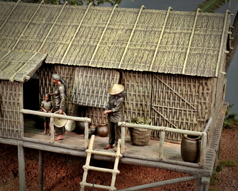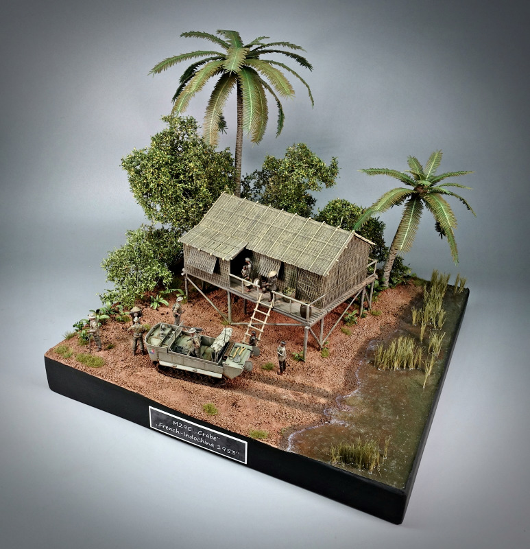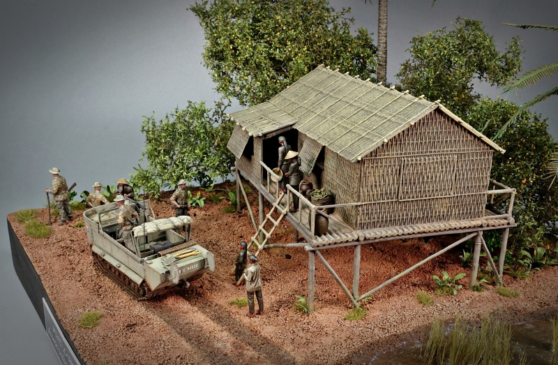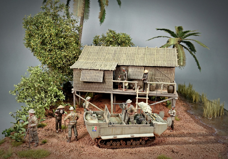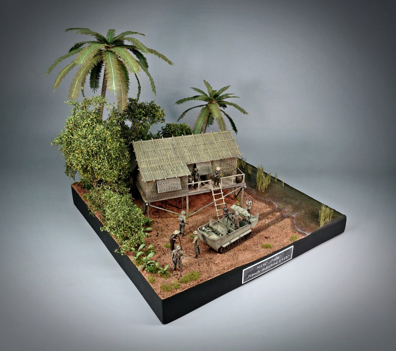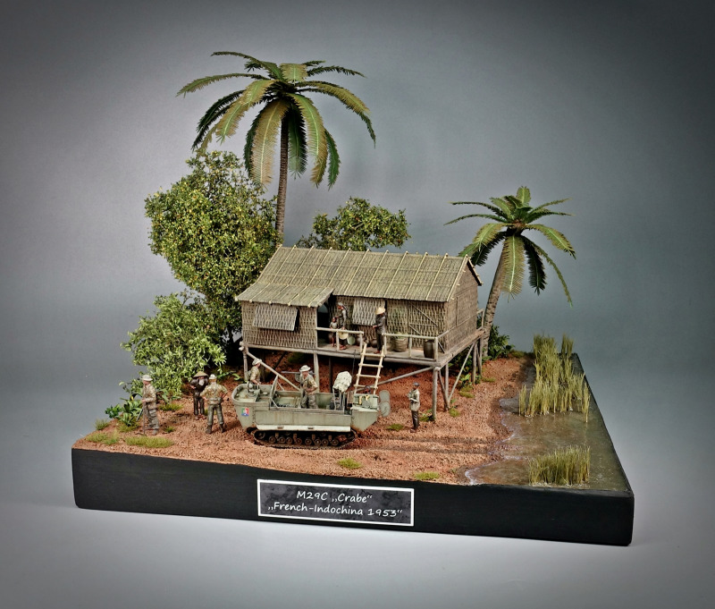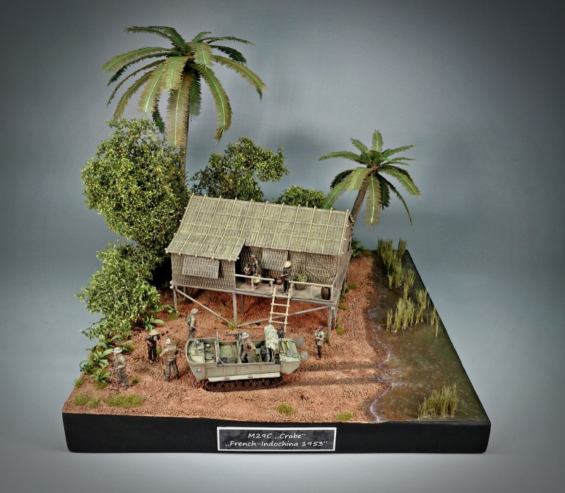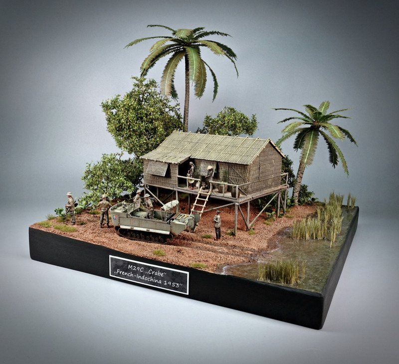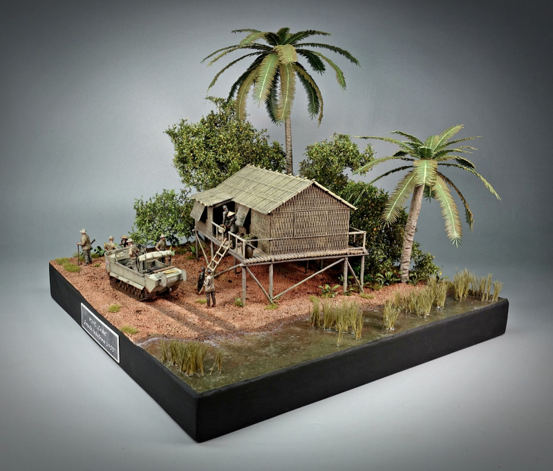 FazitWährend man den Bau des M29 eher als unspektakulär ohne besondere Vorkommnisse bezeichnen kann, gestaltete sich der Bau des Dioramas doch als anspruchsvoll und aufwändig. Immerhin wurden hier die Königsdisziplinen des Dioramenbaus in Form der Dschungelgestaltung (Vegetation) und Wasserdarstellung abgerufen. Arbeiten, mit denen der Gesamteindruck eines Dioramas enorm steigen, aber auch fallen kann und gerade deswegen von vielen Modellbauern gescheut wird. Zu schnell läuft man hier in Gefahr, viel mühselige Arbeit durch schlecht durchdachte und durchgeführte „Aktionen“ zu zerstören, bzw. vom Gesamteindruck stark zu schmälern. Eins sei hier aber gesagt: es ist kein Hexenwerk! Jeder, der wirklich bemüht ist, kann hier schnellstens Erfolge erzielen. Eine der Lösungen besteht in vielen kleinen Schritten zu denken und zu arbeiten. Fühlt man sich bei bestimmten Arbeitsschritten unsicher, schadet es nicht, sich an anderen kleinen Objekten auszuprobieren und zu testen. Auch schadet es nicht, hier zu Anfang kleiner zu denken. So sollte man von diversen Mammutprojekten Abstand nehmen und eher in kleineren Vignetten denken und sich so in den sogenannten Königsdisziplinen langsam einarbeiten. Mir hat die Arbeit jedenfalls eine Menge Spaß bereitet und ich bin mit dem Ergebnis mehr als zufrieden. Dabei entdecke ich immer wieder meine Schwäche für das kleine Südostasien, welches doch ungemeine Möglichkeiten für viele interessante Projekte des Modell-/ Dioramenbaus bietet.
