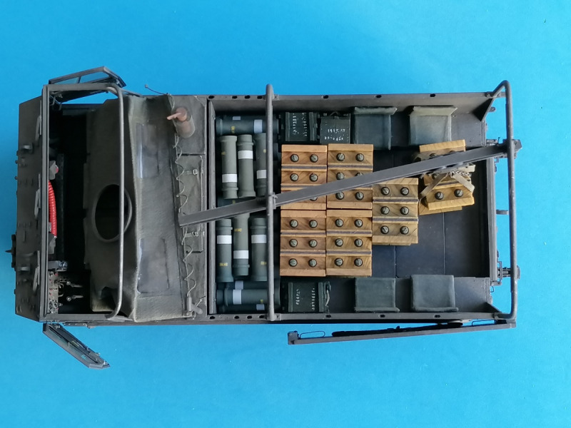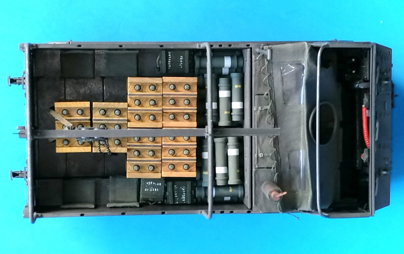 In der Ladebucht wurde der Boden B6 in der unteren Position eingeklebt. Der besteht im Original aus einzelnen Blechen, die auf der jeweiligen Ebene an den Seiten auf Winkeln befestigt werden. Um das zu simulieren, habe ich Streifen sehr dünnen Sheets in der Breite der einzelnen Bleche an die Seiten geklebt und die Schraubenlöcher für die obere Montage mit Nadelstichen angedeutet. Der Zugang zum Motorraum wird durch drei Platten ermöglicht: zwei in der Mitte übereinander (zusammen 24 x 36 mm), eine kleine mit abgerundeten Ecken über dem rechten Kettenkasten. All das verschwindet bei Munitionstransporten hinter einer Sperrholz-Wand. Die habe ich aus Sheet mit Kratzern groben Schleifpapiers gefertigt, mit Löchern für die Zurrhaken der Plane aus 0,3 mm Messingdraht, wie sie auch ringsum angebracht werden mussten.