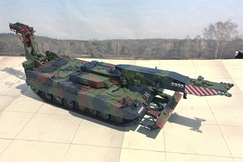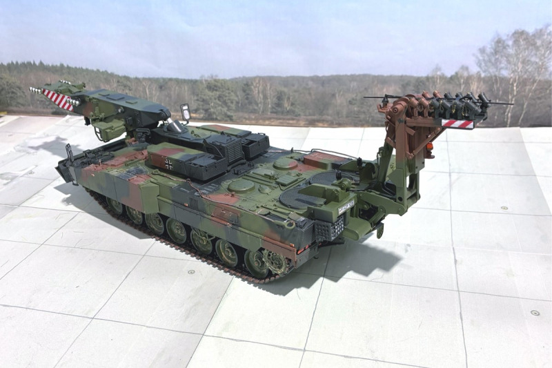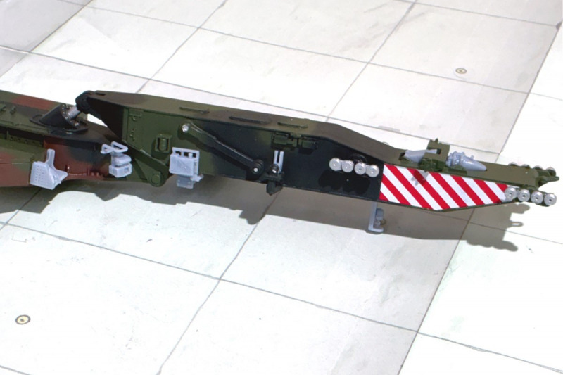 Ich hatte das Modell fast fertiggestellt, ohne großartig zu recherchieren. Dann stieß ich aber auf einen Ergänzungssatz von MAD Modellbau. Nun fing ich an, mal anhand von Bildern die Richtigkeit des Modells zu überprüfen. Wow, das Modell stimmte mit der aktuellen Version in vielen Details kaum überein. Es handelt sich bei dem Bausatz schlichtweg um ein Vorserienmodell. Die Überlegung, ob es sinnvoll ist, den Ergänzungssatz in ein fertiges Modell einzubauen: ok, Risiko. Ich bestellte zwei Sätze und fing an, die 3D-Teile ein- und anzubauen. Etwa 95 % der Teile konnte ich verwenden, ohne das Modell zu sehr zu beschädigen. Meine Sätze von MAD wiesen Höhen und Tiefen auf, aber letztlich hat es sich gelohnt, den Umbau zu wagen. Das Modell ist aber nach der Verwendung des Ergänzungssatzes immer noch nicht hundertprozentig. Besonders die Positionen der Schäkel an den Brücken stimmen mit dem Original nicht überein. Die Farben stammen von Tamiya. Die Decals sind unvollkommen, die Nummernschilder zu groß. Für die 2 × 14 Meter-Brücke müsste man ein MLC-Decal 71 verwenden. Ich habe mir einige Decals selbst erstellt und angebracht, was das Modell noch einmal ein bisschen aufwertet. Auf übermäßige Alterung verzichte ich - nur etwas an den Seiten und Laufrädern. Nachfolgend Bilder des Einbaues.