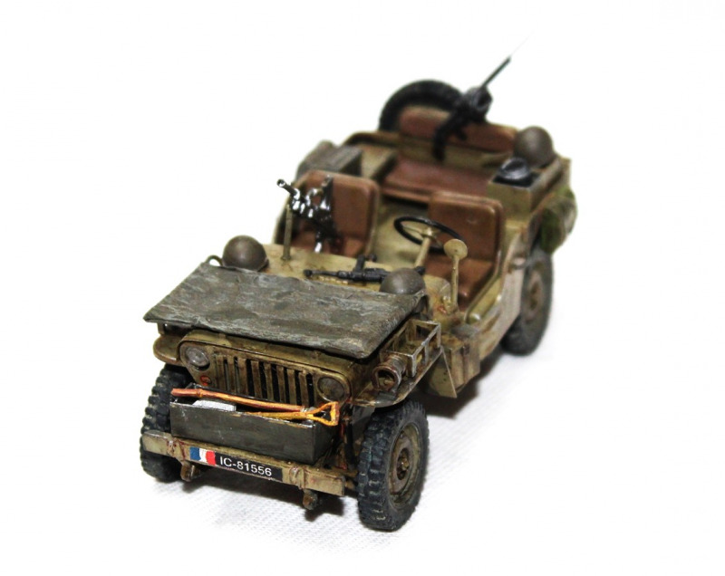 Aus dem Waffenfundus des Bausatzes wurde ein Bren-Maschinengewehr für den Beifahrer gewählt. Das am Heck angebrachte MAC 31 von Reibel mit dem auffälligen Rundmagazin („Camembert“) stammt aus der häuslichen Sammlung. Historisch relevant ist die deutsche MP 40 („Schmeisser“), die von französischen Truppen weiterverwendet wurde. Die Kennzeichen wurden am Computer angefertigt, ausgedruckt und angeklebt.