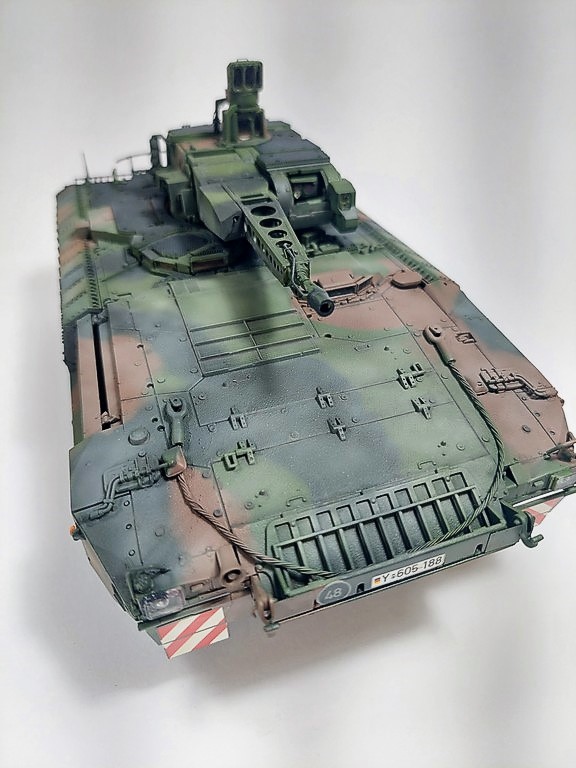 Dieses Modell des Schützenpanzers Puma im Maßstab 1/35 enstand aus dem wirklich sehr guten Bausatz der Firma Rye Field Model. Einziges hinzugefügtes Bauteil ist das Abschleppseil. Dieses entstand aus verdrillter Kupferlitze.