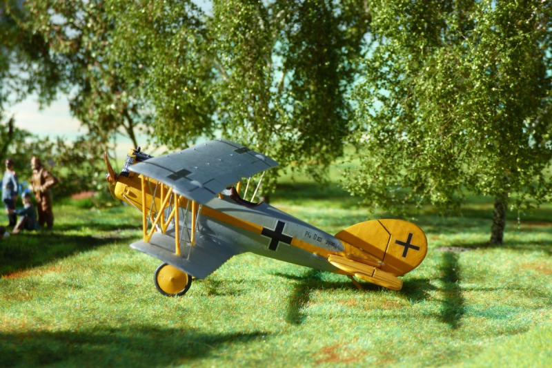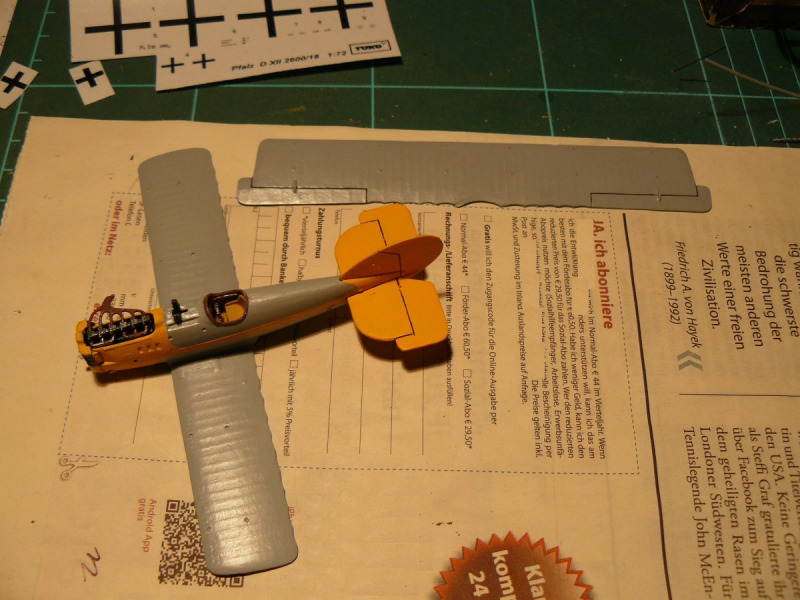 Mein Modell ist von der Firma Toko in 1:72 und aus Plastik. Ich habe mich für die eher farbenfrohere Variante des Leutnants F. Klein im Sommer 1918 entschieden. Die Jagdstaffel des Leutnants wurde auf der Bauanleitung leider nicht angegeben. Bemalt habe ich den Apparat mit dem typischen Pfalz-Grau, hier von Revell die Email-Farbe 374 und dem Gelb von Revell Nr. 15. Der Propeller wurde mit Revell Nr. 17 und Buntstift gestaltet.