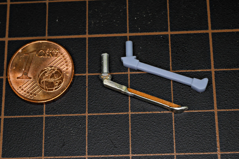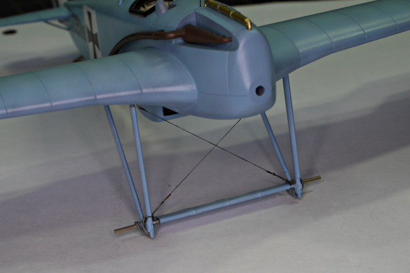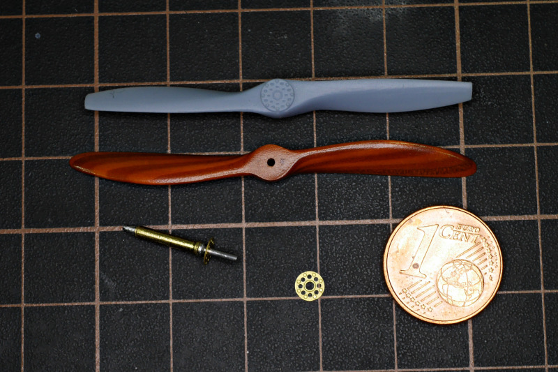 Der BauDie relativ wenigen Teile (22) des Bausatzes waren gut vorbereitet, von den Druckstützen befreit und teilweise bereits verschliffen - ein sehr guter, selten gesehener Service. Der Bausatz bietet einerseits eine gute Grundlage, andererseits konnte ich so einige Details in meinem gewohnten Scratch-Stil hinzufügen. Wie bei vielen meiner Modelle entstand die Luftschraube aus Holz. Ein Hecksporn ist enthalten, aber die Anleitung empfiehlt, ihn mit Metall zu verstärken oder zu ersetzen, um das schwere Resin-Modell (mein fertiges Modell wiegt exakt 100 Gramm) tragen zu können. So habe ich den Hecksporn aus Holz und Metall nach Fotos neu gebaut. Aus Metall habe ich dann auch das Fahrwerk neu kreiert. Das toll verpackte komplette Fahrwerk in einem Stück hätte sicher das Modell getragen, ist aber aus Festigkeitsgründen sehr stark dimensioniert. Mein neues Fahrwerk aus gequetschten Messingröhrchen und -draht ist deutlich zierlicher, damit näher am Original, aber trotzdem robuster. Damit bin ich für den Transport zu Ausstellungen auf der sicheren Seite. Ebenso aus Messing habe ich dann noch den Überrollbügel, das Propellerlager, den Wassertank über dem Motor, Streben am Heck und das offene Ende des Auspuffrohres gefertigt. Ruderhörner und Frontscheibe sind ebenfalls selbst anzufertigen.