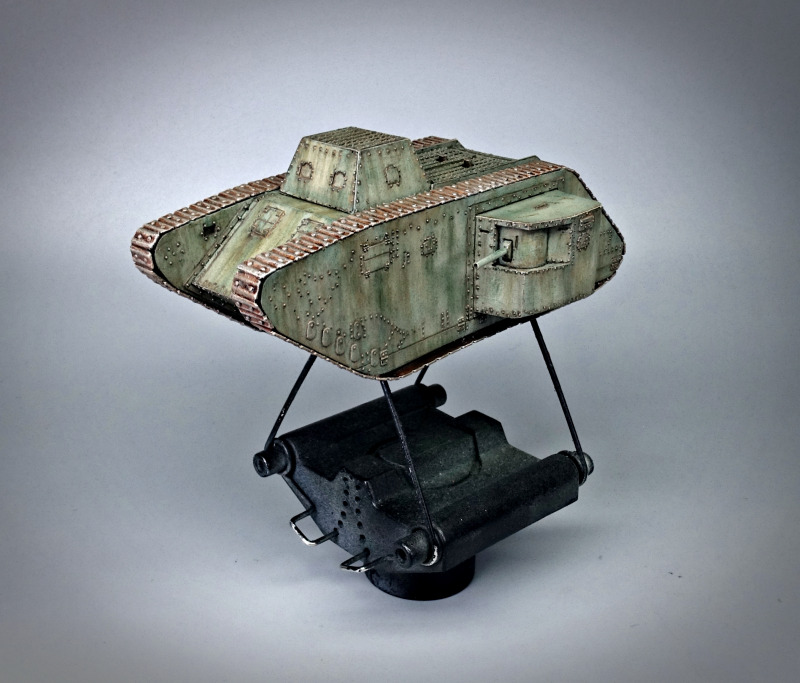 Die Figuren:Die Hauptrollen spielten hier Germania-Figuren und Munich. Während die Munich-Figurensets momentan nur noch schwer zu bekommen sind, hapert es bei Germania-Figuren an einer ordentlich strukturierten Übersicht auf der Shop-Website. So gehören die Zivilisten eigentlich zu mehreren Sets des gleichen Herstellers, die sich mit dem damaligen Attentat in Sarajevo 1914 befassen, doch sind diese kaum, bzw. nur schwer zu finden, da hier mittlerweile bei einem riesigen Sortiment eine unübersichtliche Mischung aus eher alten Resinfiguren, 3D-Prints und 3D-Daten besteht. Hier sollte der Hauptverantwortliche in Sachen Bedienerfreundlichkeit unbedingt mal Abhilfe schaffen. Ich hatte mir dieses Sets schon vor Jahren zugelegt und fand diese für die geplante Szenerie mehr als passend. Mein Gedanke dabei war, eine Szenerie zu erstellen, bei den der A7V-U während der Erprobungsfahrten in Berlin 1918 einer kleiner Delegation von Persönlichkeiten aus Militär, Politik, Rüstung oder Wirtschaft vorgestellt wird. Der ersten Euphorie folgte ja dann bekannterweise schon bei vorhandener Skepsis anderer schlussendlich pure Ernüchterung. Die Bemalung erfolgte hier ausschließlich mit Ölfarben.Nach der Bemalung und Mattierung (Acryl-Mattlack) erhielten die Figuren dann ihren vorgesehenen Platz auf dem Diorama. Fazit:Und wieder habe ich mich mit einem Modell weit abseits des „modellbauerischen Mainstreams“ beschäftigt. Das machte es für mich nicht weniger interessant, vor allen Dingen, da ich eh eine gewisse Vorliebe und Schwäche für Außenseiter-Modelle habe, die in der breiten Masse nur wenig Anklang finden. Im Grunde war es auch eins der kurzweiligeren Projekte, bei dem es keine Probleme oder Hürden gab. Hier konnte man sich entspannt und glücklich an seinem liebsten Hobby abarbeiten. Schlussendlich hat man seine Sammlung wieder mit einem Modell bereichert, welches nur wenigen bekannt sein dürfte und sich deswegen auch vielleicht ein wenig von der üblichen Masse absetzt. Immerhin wird sich hier der eine oder andere fragen, ob es sich hier nun um einen „verunglückten“ A7V oder Mk. IV, bzw. eine Mischung der beiden etwas mehr bekannten Protagonisten handelt.