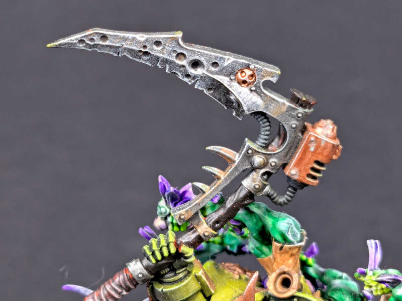Typhus kämpft mit einer riesigen Energiewaffe, die als Pestsense bezeichnet wird. Es geht das Gerücht um, dass Typhus die Klinge seiner tödlichen Waffe einst in die Eitertümpel von Nurgles Garten tauchte. Ganz egal, ob dieses Gerücht stimmt oder nicht, die geringste Berührung der schmutztriefenden Waffe verwandelt beinahe jedes Opfer in einen blubbernden Haufen faulen Fleisches und morscher Knochen. Quelle: Warhammer 40.000 Conquest, Hachette