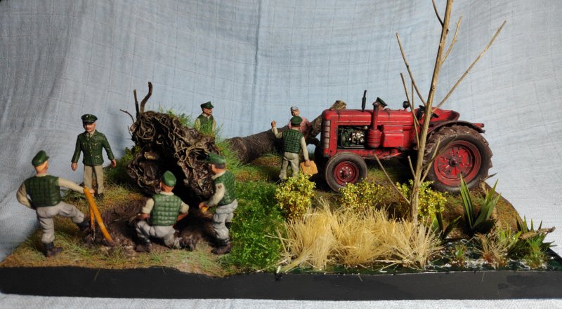 Damit war dann der Traktor fertig. Mit den Figuren war es nicht so einfach. Wirklich „richtige“ Figuren habe ich nicht gefunden. Also habe ich mir beholfen mit umgebauten Weichplastik-Figuren, die ich auch mal auf einem Flohmarkt ergattert hatte. Da das ganze in den 60ern des letzten Jahrhundert spielt, kann man mit etwas gutem Willen die Figuren als Polizisten durchgehen lassen. Zu den Weichplastik-Figuren kann ich nicht viel sagen, außer, dass sie grün sind und mich an US-Soldaten in Korea erinnern und in etwa zu 1:32 passen.