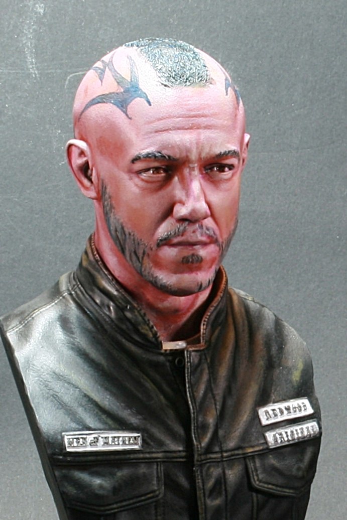 Hier hat sich bei der letzten Büste der Modelleur gedacht, er sculpted die Badges auf der Lederjacke mit, was ich aber persönlich nicht so gut finde. Ich wollte sie aber auch nicht abschleifen, weil sie bei meinem Sohn in der letzten Reihe steht. Juice Ortiz, gespielt von Theo Rossi, ist ja auch nur ein Anwärter. Hier habe ich zum ersten mal Tattoos gemalt, war eine echte Herausforderung für mich - das Ganze auch noch freihand! Da sind wir doch mal gespannt, ob noch mehr Charaktere aus der Serie gesculpted werden...