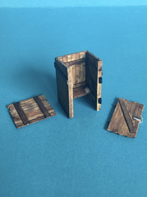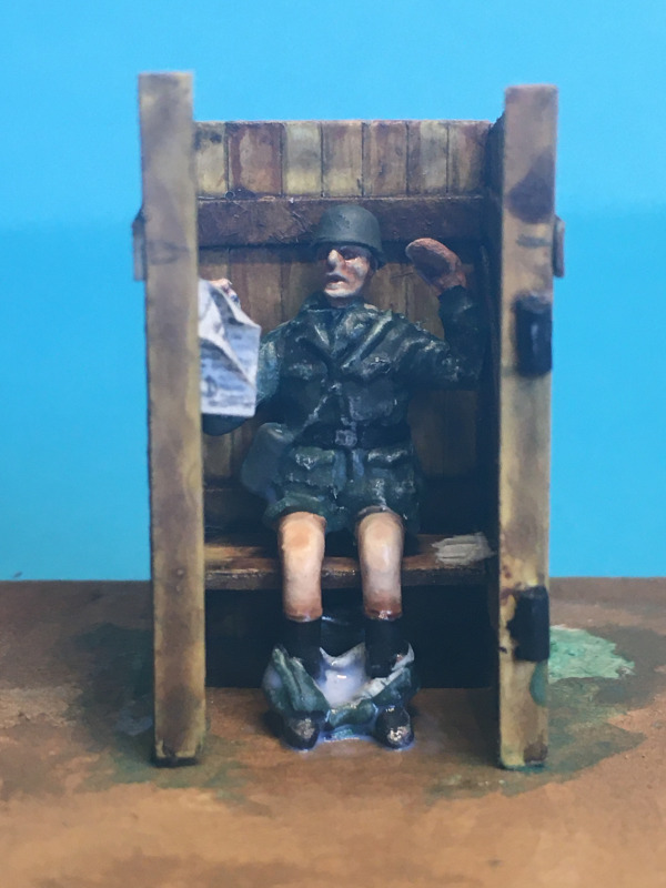 Die IdeeDas kleine Diorama spielt im Herbst 1944 in Frankreich. Eine amerikanische Patrouille hörte verdächtige Geräusche aus einem Klo-Häuschen auf dem Gelände eines Bauernhauses. Ein außerhalb angelehnter deutscher Karabiner verriet, wer der „Besatzer" war. Also riss man die Türe auf und - schwupps - hatten die GI´s einen deutschen Meldegänger gefangen! Der Arme war nicht nur völlig überrascht, sondern auch äußerst peinlich berührt...