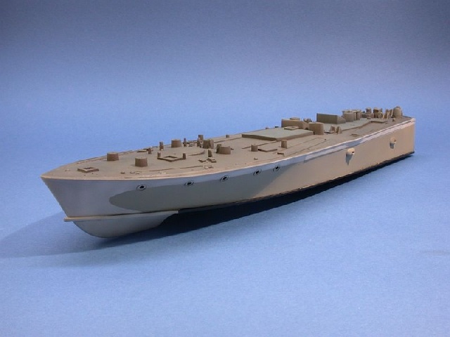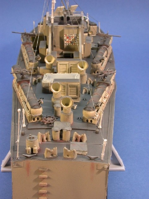Die Torpedorohre mussten verspachtelt und verschliffen werden, die Öffnungen mußten mit der Fräse erweitert werden, da sie für die Torpedoköpfe zu eng sind – hier kann man sonst leicht die Mittelnaht beim Versuch des Einbaus sprengen. Die Tarnlackierung wurde wie folgt erstellt: Zuerst wurde die gesamte Baugruppe weiß gespritzt. Nach dem Trocknen wurde der untere Teil leicht abgeklebt und G 45 gespritzt. Dieses wurde wiederum leicht abgeklebt und das obere Drittel vorsichtig dunkelgrau gespritzt. Daraufhin konnte der Sockel von Hand G 45 bemalt werden. Die Gefechtsköpfe der Torpedos wurden mit Vallejo–Acrylfarbe dunkel sandfarben bemalt, der Aufschlagzünder silbern.