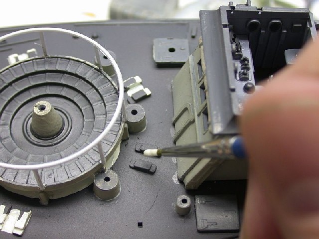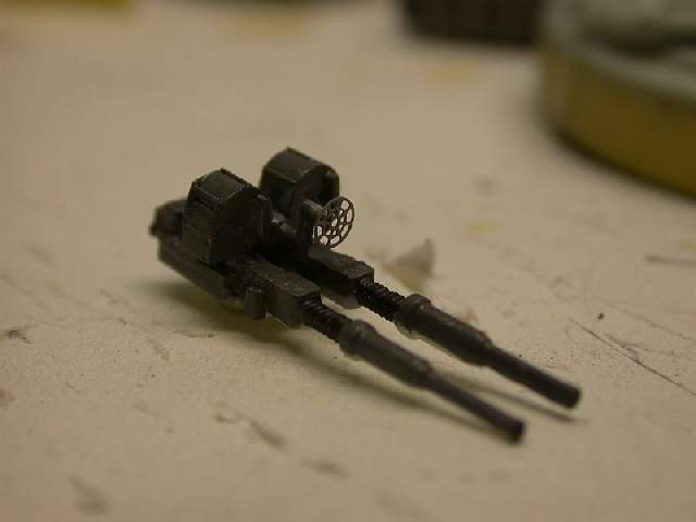 Die diversen Waffen wurden versäubert, dunkelgrau bemalt und mit Model Master Titan Metalizer trockengemalt. Visiere entstanden aus einem sehr nützlichen 1:250er Ätzteilbogen von Scheuer & Strüver, sie sollten eigentlich mal Kabeltrommeln werden. Man könnte sehr gut die Oerlikon und die Lewis Guns durch Resinteile z.B. von Great Little Ships ersetzen, aber ich habe sie aus dem Kasten angebaut. Wie immer ist nach oben in Sachen Einsatz und Detaillierung die Grenze für jeden individuell angesiedelt. Die vorderen „MGs“ sind im Original Leuchtgranatenwerfer vom Typ Holman und sollten eigentlich mit dickeren Rohren umgebaut werden, aber das habe ich (vorerst) unterlassen. Sie sind aber nur aufgesteckt und lassen sich leicht ersetzen. Die zahlreichen Lüfter wurden zusammengebaut, verspachtelt, verschliffen und vorsichtig innen ausgefräst. Dann konnten sie in G45 grundiert und im Tarnmuster bemalt werden.