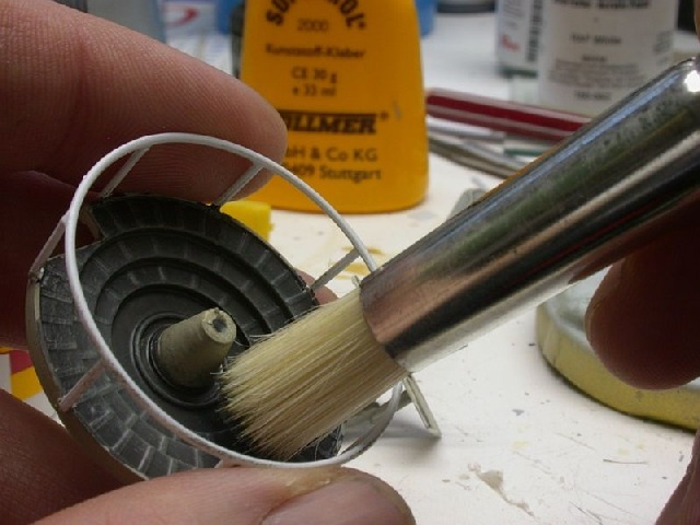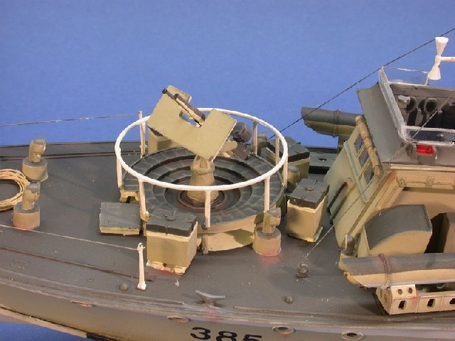 Der Bereich der Rumpfnummer wurde hochglanzlackiert. Nach dem Trocknen wurden die Decals aufgebracht; diese erwiesen sich airfixtypisch als empfindlich, brüchig und sehr matt. Ein weiterer Überzug mit Hochglanzlack beseitigte die Mattigkeit, und nach einem Mattlacküberzug wirkte die Rumpfnummer fast wie aufgemalt. Das Boot wurde größtenteils aus dem Kasten gebaut, und es ging ziemlich schnell. Die Auspuffrohre wurden durch Aluminiumröhrchen angedeutet, die Stützen der Geschützplattform mit einer Feinsäge sowie einer Minischleifmaschine mit Hartmetallfräse abgetragen. Das Ruderhaus wurde als Unterbaugruppe erstellt und erst später am Deck befestigt, um die Bemalung zu erleichtern, ebenso wie die Torpedorohre. Nach Befestigen der Auspuffrohre wurde der Rumpf im Ganzen zusammengebaut. Einiges Spachteln ließ sich dabei nicht vermeiden, ich verwendete Mr Surfacer 500 von Gunze. Die Bemalung erfolgte soweit möglich mit der Airbrush, abgeklebt wurde mit Tamiya Tape. Die Decksfittings wurden mit dem Pinsel bemalt. Die Klarsichtteile für die Bullaugen und Brückenfenster wurden weggelassen, diese Öffnungen wurden ganz zum Schluß mit Kristal Kleer (anderer Weißleim geht auch) gefüllt.