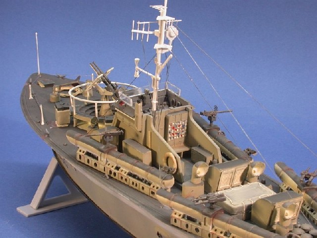 Der Mast wurde bis auf den obersten Teil, der ziemlich dick, krumm und nicht rund im Querschnitt war, und bis auf die Radar-Dipole, aus dem Kasten verwendet. Die Dipole wurden mit den Bausatzteilen als Muster aus Kunststoffprofilen und Messingdraht von Lion Roar nachgebaut, das Oberteil des Masts ist ein Stück Stahldraht. Die Signalrah ist ein Stück Draht aus einer Stahlbürste. Eine solche Bürste reicht vermutlich für ein Modellbauerleben in Sachen Masten und Rahen; der Stahldraht ist schön stabil und eignet sich sehr gut. Ansonsten empfehle ich gedrehte Masten, z.B. von BMK. Die Bemalung wurde komplettiert mit dem Anbringen des weißen Countershadings an allen im Schatten liegenden Bereichen, also unter der Geschützplattform, den Bereitschaftsmunitionskästen, unter dem Windabweiser an der Brücke, an den Unterseiten der Lüfter usw. usf. Ich benutzte hier kein strahlendes Weiß, sondern RAF – White von JPS Modell, das ein gebrochenes Weiß ist und mir stimmiger erschien. Reinweiß wurden nur die Relingsstützen, die Geschützreling, die Rumpfseiten sowie der Mast bemalt, aber in allen Fällen wurde dieses Weiß durch nicht deckendes Aufbringen oder Trockenmalen auch abgeschwächt. Die einzigen Farbtupfen an dem Boot sind die Positionslichter und der Flaggenschrank, den ich mit zahlreichen Tupfen von Weiß, Rot und Blau versah, um die verschiedenen gefalteten Signalflaggen darin zu simulieren.