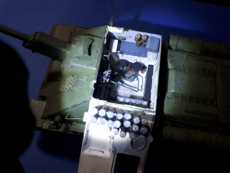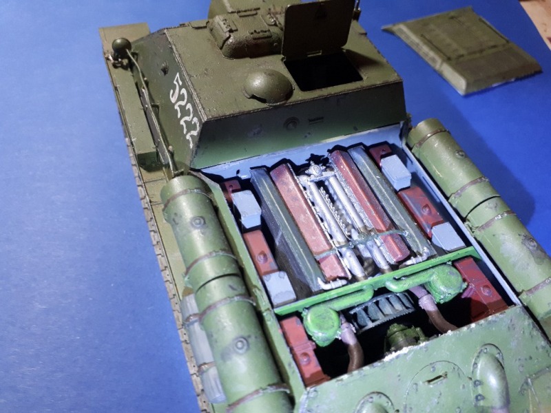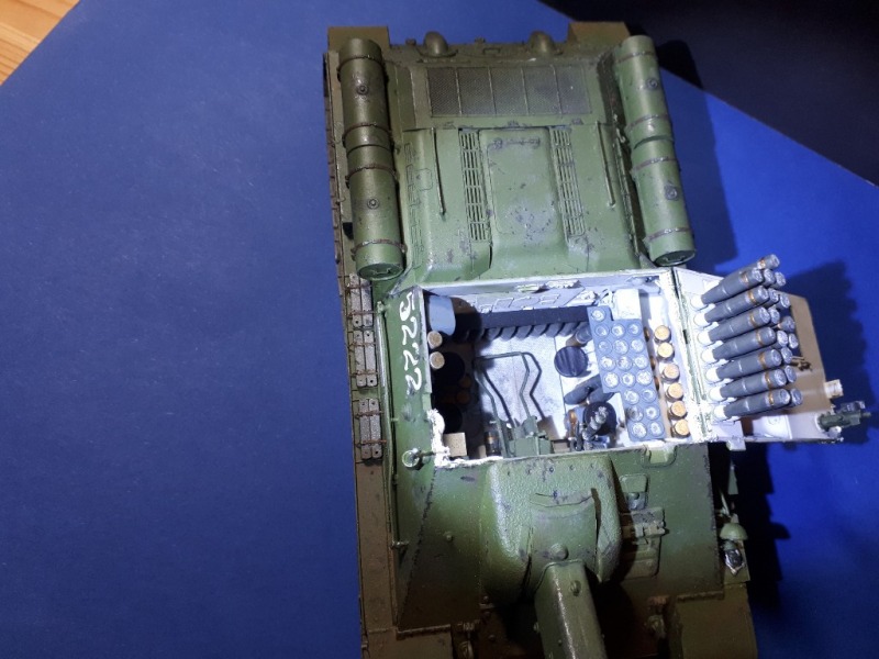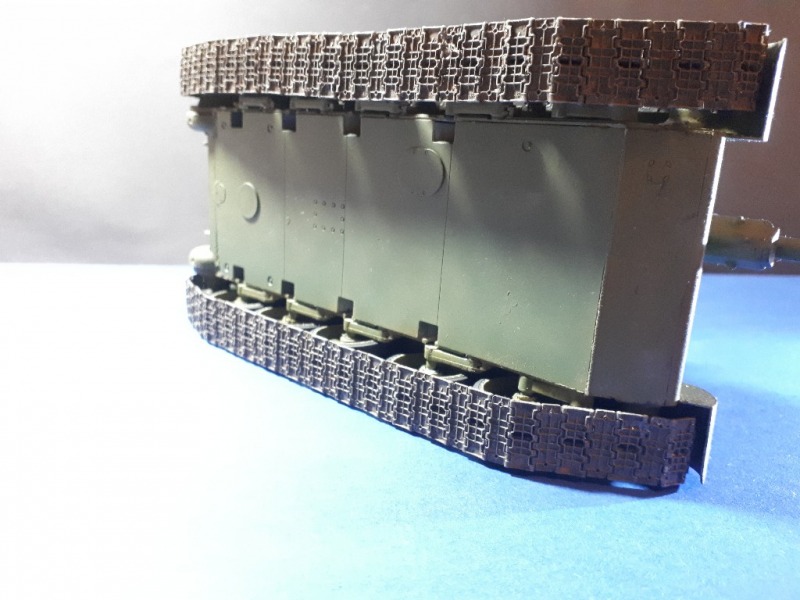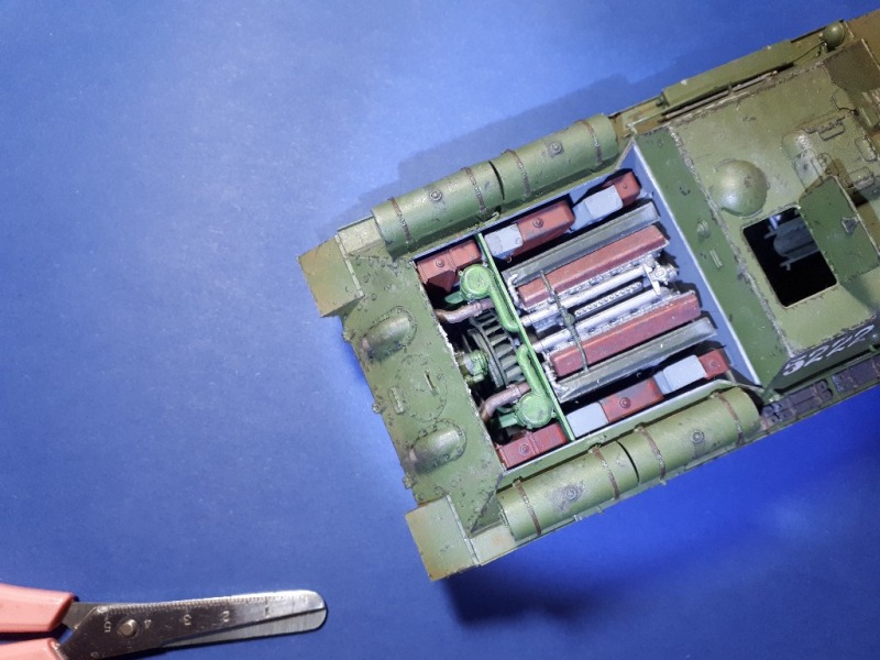 Ein paar Kanckpunkte will ich dennoch nennen: Zum einen ist das Plastik vom Hersteller sehr weich, man verbiegt schnell Teile und bricht sie an machen Stellen ab, insbesondere da, wo die Teile ohnehin sehr dünn sind. Des Weiteren sind die EGKs zwar sehr schön, allerdings brechen die Haltenasen beim Einfädeln sehr schnell weg und müssen daher trotzdem geklebt werden. Gerade beim Anbringen an das Fahrwerk standen die Ketten sehr unter Spannung, so dass ich hier die letzten Kettenglieder mit Sekundenkleber kleben musste, damit die Ketten halten. Ein weiterer Problemfall war das Darstellen des Interieurs, ohne dabei die Außenhaut aufzuschneiden. Meine Lösung war hierfür die oberen Teile abnehmbar zu machen und mit einer Art Klebknete aus dem Bürobedarf habe ich die Teile fixiert.