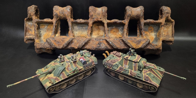 Ich beschloss Metallketten und Bolzen von Xanxin (ca 30 €), Ersatzkettengliedhalter von Heavy Hobby ( ca 10 €), Figuren von Mironious Models (ca 10 €), Jagdpanther Zubehörset von Black Dog (ca 26 €), und die Antenne von Aber (ca 3 €) zu verwenden.