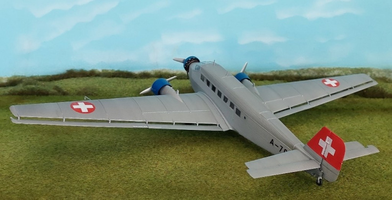 Sämtliche Innenteile wurden grundiert und bemalt. Als das ganze Modell zusammengebaut war, später auch aussen grundiert, schwarz bemalt und nach dem Trocknen mit Silber gespritzt. Die Motorenabdeckung wurde mit Revell-Blau gespritzt, das Seitenruder rot bemalt, zuletzt mit Klarlack gespritzt und die Schweizerkreuz-Decals angebracht.
