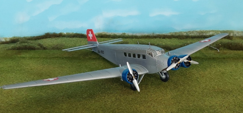 Der Bausatz ist von Italeri im Maßstab 1:72, gute Spritzlinge, nur dass man ein bisschen die Teile entgraten muss. Ich habe die Ju 52 in einer schweizer Version gebaut und zwar mit der Immatrikulation A-703, früher HB-HOP.