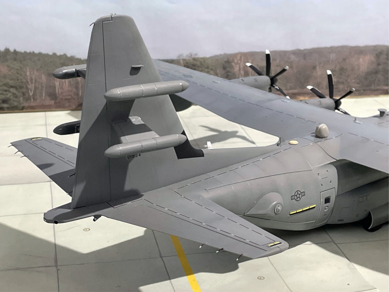 Das ModellDas Modell dieser EC-130J Commando Solo entstand aus dem Zvezda-Bausatz der C-130J. Auch hier wurden wieder diverse Verstärkungsstreifen und -platten am Rumpf angebracht. Der Air Refueling Bereich (ARR) musste ebenfalls neu aufgebaut werden. Die Rumpfunterseite erhielt viele neue Antennen, der Heckkonus ist neu gestaltet. Aber am meisten Arbeit ging in die Gestaltung der vier Antennen am Seitenleitwerk und den Blatt-Antennen unter den Tragflächen. Die beiden großen Pods (keine Tanks) wurden aus Kunstharz gegossen und dann in Handarbeit in Form geschliffen. Es handelt sich dabei um Aufnahmebehälter für elektronische Ausrüstung. Also viel Arbeit, die sich aber immer lohnt, denn das Modell wirkt dadurch doch recht beeindruckend. Einige der Baustufen im Überblick