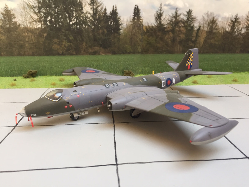 Die Canberra war der erste in England nach dem Zweiten Weltkrieg entwickelte mittlere Bomber. Sie sollte die überaus erfolgreiche Mosquito ersetzen, und wurde auch in relativ großen Stückzahlen produziert in unterschiedlichen Versionen und Aufgabenbereichen. Wer mehr wissen möchte, findet zu diesem Flugzeugmuster viele Informationen im Netz oder an Hand von Buchausgaben. Von Airfix gab es einen Bausatz ab den 1970er Jahren, welcher noch erhabene Details aufwies. Der größte Fehler bei diesem Modell war der zu dicke Bugbereich. Die Bugverglasung für den Bombenschützen war fast doppelt so groß, wie sie hätte sein müssen.