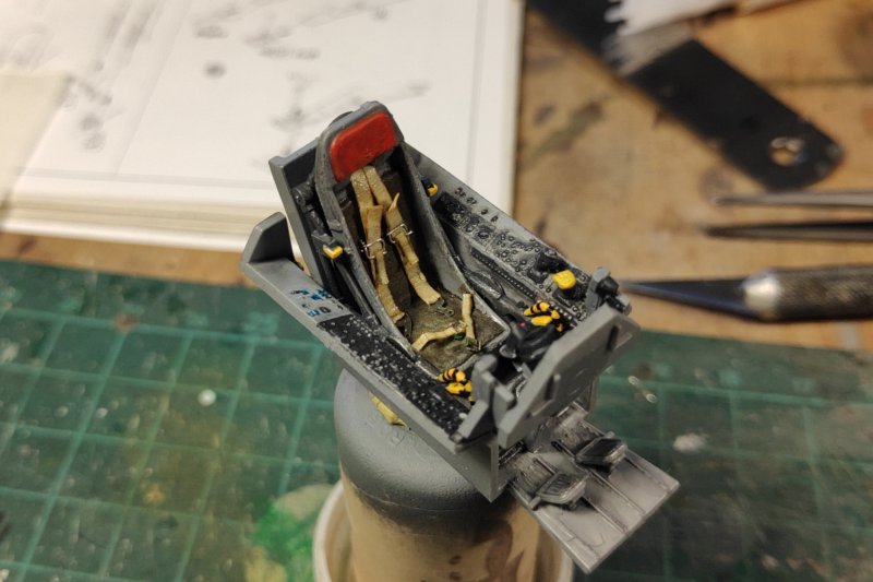 Der Revell Bausatz ist schon etwas älteren Datums. Das ist ausnahmsweise sogar gut, da der Bausatz der Sabre Dog aus der koreanischen Phase bei Revell stammt. Die Formen der Dog wurden in Korea hergestellt und sind mit das Beste, was man bekommen kann ... leider auch das Teuerste. Das merkt man dem Bausatz tatsächlich wirklich an. Die Detaillierung ist wirklich gelungen. Die Gravuren sind sehr sauber ausgeführt und gleichmäßig stark und tief. Grat sucht man vergeblich. Gebaut habe ich somit fast nur aus der Box. „fast“, weil mir die an den Sitz geprägten Gurte nicht gefallen haben, diese habe ich abgeschliffen und durch Eigenbau aus Malerkrepp ersetzt. Alles andere wurde aus der Schachtel gebaut und bemalt.