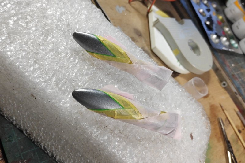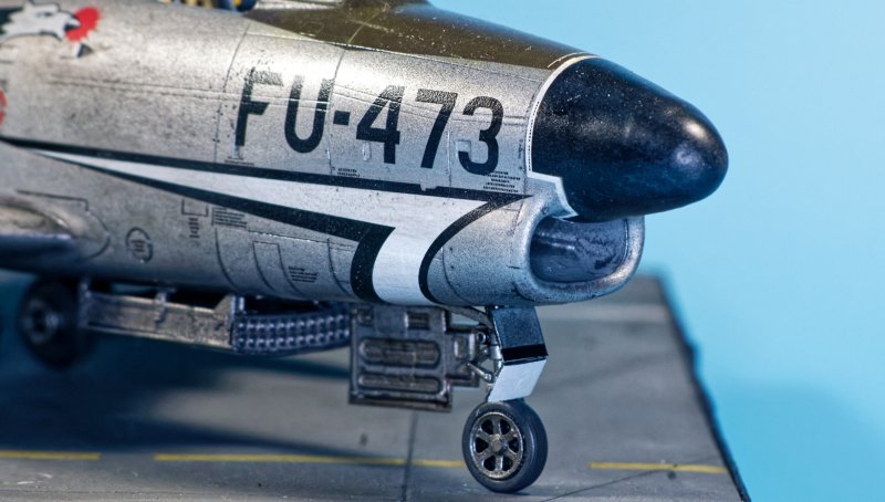 Als Variante habe ich mich für die North American F-86D-35—NA Sabre der 445ten Fighter Interceptor Squadron von Capt. A. G. Limpantsis, Geiger AFB, WA von Dezember 1954 entschieden. Es musste also eine Naturmetall Bemalung werden. Dafür gab es nach der üblichen Grundierung einen glänzenden schwarzen Überzug. Darauf kamen dann „UA 793 White Aluminium“, UA 792 Polished Aluminium„“ und „UA 795 Steel“ aus der Lifecolor Box „Perfect Metal Set 2 – Aircraft“. Wie üblich mit einer Menge abkleben, um einzelne Bereiche in unterschiedlichen Metalltönen zu lackieren. Vor den Decals wurde dies mit Vallejo „Metal Color Gloss Metal Varnish“ versiegelt.