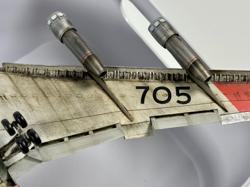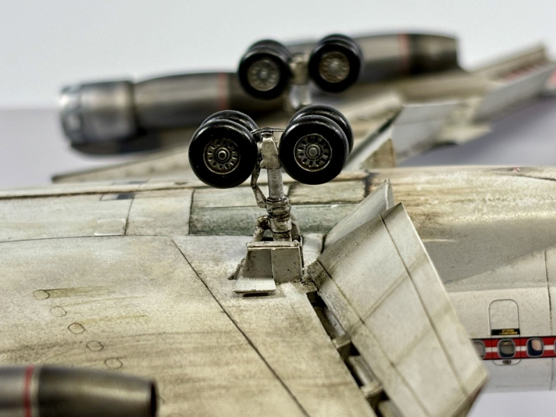 Um den ausgefederten Zustand des Fahrwerks im Landeanflug korrekt darzustellen, habe ich die Fahrwerksbeine mit Evergreen-Rundstäben verlängert. Bemalt wurde das Modell wie gewohnt per Airbrush mit Acrylfarben. Für die Markierungen griff ich auf einen Mix aus 26Decals, Authentic Airliners und teilweise Nazca Decals zurück.