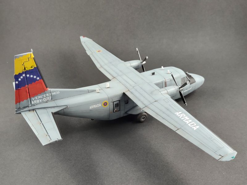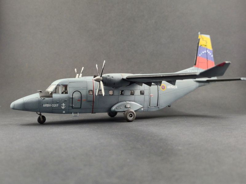 Zum OriginalDie Casa C-212 ist ein für primär militärische Zwecke entwickeltes Transportflugzeug. Hersteller war die Construcciones Aeronáuticas S.A. (CASA) aus Sevilla, welche seit 1999 Teil von EADS ist. Zwischen 1971 und 1993 entstanden mehr als 400 Exemplare der verschiedensten Versionen. Seit 2016 produziert der indonesische Flugzeughersteller PT Dirgantara Indonesia (Persero) die C-212 unter der Bezeichnung NC212i weiter. Der Hochdecker ist mit zwei Turboproptriebwerken Honeywell TPE331 ausgestattet. Das hier dargestellte Modell zeigt eine C-212-400. Die verbesserte 400er-Serie ist mit 925 PS starken TPE331-12JR-701C-Triebwerken ausgestattet und weist eine erhöhte Nutzlast sowie verbesserte Avionik auf. Der Erstflug fand am 4. April 1997 und ersetzte ab 1998 produzierte 300er-Serie. Zwischen 1981 und 1988 erhielt die venezolanischen Marine vier Transportflugzeuge des Typs C-212 Serie 200 Aviovar und vier Seeaufklärungsflugzeuge des Typs C-212-S43 sowie drei weitere Transportflugzeuge der modernisierten Version C-212-400. Die C-212-200 und 400 sind dem Taktischen Transportgeschwader der Marineflieger, die C-212-S43 dem Seeaufklärungsgeschwader der Marineflieger zugeteilt.